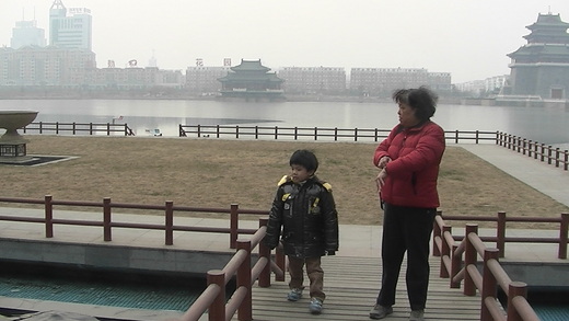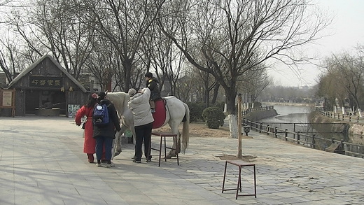 接下來是去參觀清明上河園,它坐落於龍亭湖西岸,是依照北宋著名宮廷畫家張擇端的傳世之作「清明上河圖」為藍本所建。「清明上河圖」描繪了清明時節北宋京城汴梁及汴河兩岸的繁華和熱鬧的景象和優美的自然風光。作品以長卷形式,採用散點透視的構圖法,將繁雜的景物納入統一而富於變化的畫卷中,畫中主要分開兩部份,一部份是農村,另一部是市集。畫中有814人,牲畜60多匹,船隻28艘,房屋樓宇30多棟,車20輛,轎8頂,樹木170多棵,往來衣著不同,神情各異,栩栩如生,其間還穿插各種活動,注重情節,構圖疏密有致,這幅畫作對於各種形態的幾何正確描繪性使其負有盛名。清明上河園則讓我們可以更近距離的去體會北宋時,東京汴涼富甲天下的情形。裡面的服務員以及商家都是宋朝人的裝扮,更有人會打扮成為宋朝時守城門的將軍武士,在園裡巡邏;有時候,他們還會假裝抓到了犯人,遊街示眾。園內還不是會有一些仿當時的街頭賣藝人的表演,如氣功噴火,或者是拋繡球招親等等。心鵬與心惟各自坐了駱駝與白馬以及共同乘坐羊車繞行園內一圈。