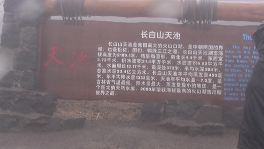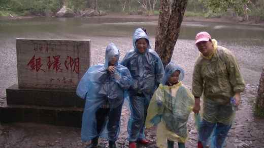 我們六點起床,用完早餐後,七點半準時出發前往長白山。要出發的時候發現天氣已經開始變陰了,還有點飄雨的感覺,心裡就覺得毛毛的。越往山上走,雨下得越大,到了山門口,雨好像倒下來的一樣,我們只好去買雨衣、租雨鞋。我們先坐遊園車,然後再換吉普車上山,風雨一陣一陣,偶爾我們可以看到很青的山頭,讓我們燃起了無限的希望,但是一會又是一陣風急雨大的暴風雨,澆熄了我們的希望。坐在吉普車上,沿路的景點非常壯觀,可是雨是越來越大,到了天池,風雨大的好像在刮颱風一樣。導遊小賈說,天池上面的風一年有兩百多天會刮八級風,氣溫則降到十幾度,心鵬、心惟凍的像什們一樣。讓他們先到屋子裡面休息,我則迎著風向天池行去。風很大,我都差點走不動了,很可惜的是,霧也很大,整個天池都被霧給鎖住,看都看不倒。我們只好草草的走一圈,就趕快坐車下山。