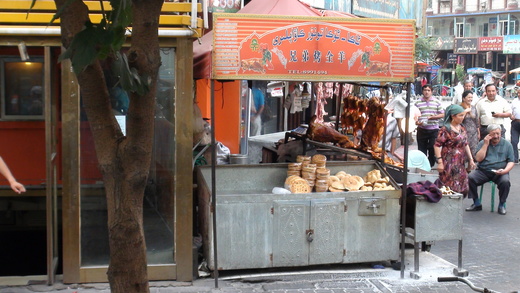 我們在下午四點半的時候抵達新疆國際大巴扎。巴扎是維吾爾語裡市場的意思,以前在南洋也稱市場為巴薩,不知道兩者是不是一樣的意思?新疆國際大巴扎是新疆烏魯木齊的大型地標建築,於西元2003年落成,採伊斯蘭建築風格,總建築面積10萬平方米,位於天山區解放南路與團結路交匯處的二道橋,是新疆最大的民族特色購物市場,也是世界第二大巴扎,僅次於土耳其。它有四棟建築,但是每一棟都大同小異,可以選擇性的逛,我們挑了一棟有家樂福跟肯德基的商場進去,裡面主要賣的是當地特產,如葡萄乾等各類乾果以及一些維吾爾族服飾、小刀等等。我們本來想要進去家樂福逛逛,看看跟台灣家樂福有什們不同,但是門口守衛要求我們必須把包包寄放在櫃台,只好作罷。新疆有肯德基但是沒有麥當勞,因為麥當勞有大肉做的食物,所以在新疆沒有市場。