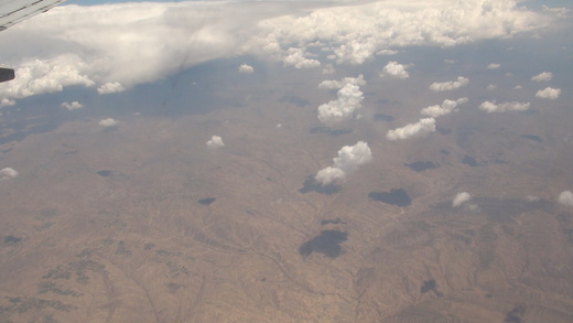 11:30飛機再度起飛,從飛機上往下看,看到滾滾長江在底下蜿蜒而過,連綿的綠地綠蔭匆匆。突然之間,景色為之一變,成為綿延的黃土高坡,朵朵的白雲從飛機下面飄過,好像棉花糖一樣。再往前飛一陣子,景色又變成漫漫黃沙,一望無垠的沙漠。穿過了沙漠來到新疆上空,看到一片紅山,應該是因為鐵氧化的關係造成山頂紅紅的一片,但是非常壯觀非常漂亮。飛機上的人拿出相機想要拍下這難得一見的美景,不過都被空服員給阻止了。