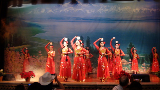 我們六點半回到飯店,七點離開飯店去用餐兼看巴扎歌舞秀。我們一邊吃著烤羊肉,一邊欣賞新疆少數民族,如維吾爾族、蒙古族、哈薩克族…等等的歌舞表演。一客要價298元人民幣,雖然價格不菲,但是既然來了這們一趟,就要多嘗試、多了解,就算是走馬看花,也是加深我們對這個地區的認識。歌舞表演的最後則隨機拉一些客人上台一起跳舞,阿發舅舅也被拉上去,他還被選中表演求婚記,晚宴就在他向維吾爾族美女的求婚中達到最高潮。