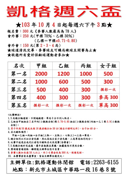 (1) 原賽前一天接受預約報名……等規定,即日起改為週賽當天下午2點30分開放現場繳費報名隔週週賽(不接受預約與未繳費者報名)直至78人額滿為止。 (2) 已報名繳費者恕不退費,如因故不能參賽請事先來...