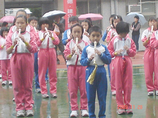 說著說著,女兒的表演節目終於要開始了,當大家就定位要開始吹奏“朋友”時,老天爺又開始下起雨來了!哎,真是天公捉弄人,小朋友們的表演只能趕快結束,回教室擦頭髮。