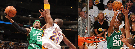 這場比賽,塞爾提克最關鍵的,就是Ray Allen的神射,三分球投11中8、二分球投20中11、豪取32分,以及小將Rondo的大三元(19分12籃板10助攻)優異表現,還在最後緊要關頭,連續偷走Kobe及Fisher的球,帶領塞爾提克突破重圍搶下一勝。