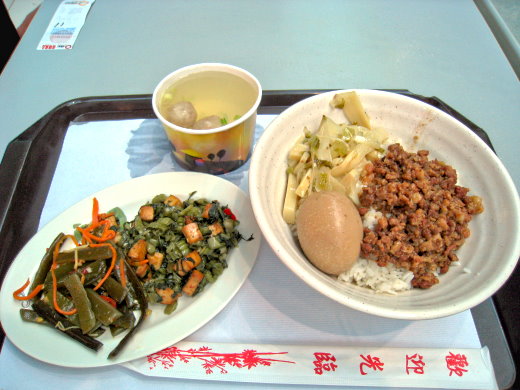一般這類的飯也稱為滷肉飯或魯肉飯,不過我也認為比較正確一點的稱呼應該是肉燥飯。這客肉燥飯沒有什麼特別,就跟一般在路邊所吃的沒有兩樣,或許只能說他多了兩個小菜,加上了一顆滷蛋罷了,在口味上那顆滷蛋甚至還沒有入味,小菜是冰冷的。所以結論就是說,這只是一客非常平常的肉燥飯而已。