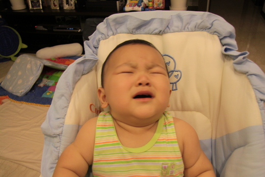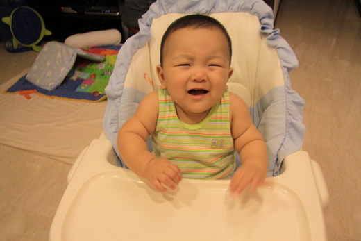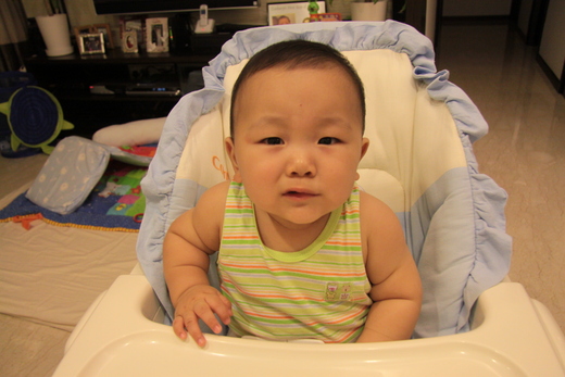 8個月大, 重11公斤,高72公分. 長6顆牙,正在長第7顆. 中午跟晚餐可以吃一大碗粥. 吃蘋果會有清脆的卡卡聲. 會裝咳嗽裝哭要人抱抱, 喜歡往外跑. 一天拿著相機對他拍, 從裝哭, 假哭, 假笑, 到小哭, 一直到生氣大哭. 從頭到尾我都沒有講話只是把相機對著他, 看他一人表演. 現在正在學自己站起. 謝謝你帶給我們家的快樂