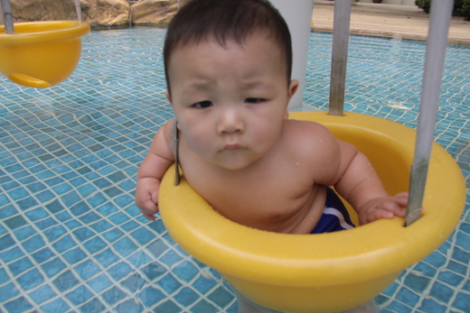 爸比的同事趁著長假星期日來家裡坐坐, 主要當然是來看Zachary. 阿姨的手藝很巧, 還帶來自制的魯味加菜. 後來還陪著我們帶翰翰下去玩水. 其實買游泳尿布一陣子了, 但有時看翰翰還有一點點的running nose, 就一直拖著. 但是這次下水也沒有玩的很盡興. 可能是因為爸媽在家, 翰翰都不好好睡覺. 變成一坐在吊椅裡晃二下他就想睡了. 最後竟然在float裡飄著飄著睡著囉. 小孩子就是這樣等抱上來擦乾喝水吃蘋果後他精神就來了. 可惜, 貝比, 我們要回家休息. 謝謝爸比換泳褲下去陪翰翰玩