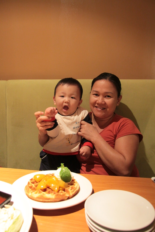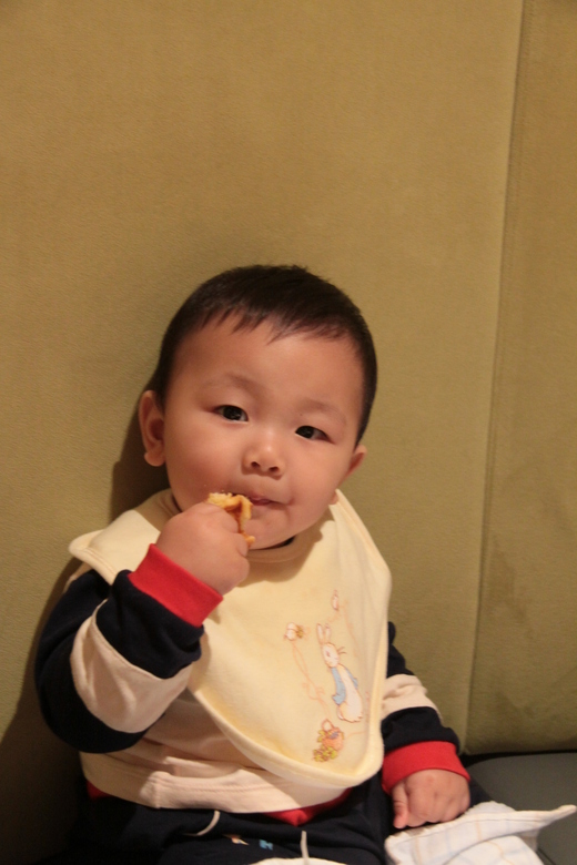 上個星期Marilou阿姨生日, 我們全家一起到NewYorkNewYork吃飯慶祝. 我已經9.5月大, 高74.5公分, 體重維持在12公斤. 學會用walker走路, 吃方面當然是沒問題的. 會開冰箱 - 就說跟吃有關的不用訓練 會用walker走路. 喜歡拔爸比的腿毛, 爸比假裝笑, 翰翰會很有成就的大笑, 樂此不疲早上媽咪上班會哭哭, 媽咪下班後要馬上抱抱, 現在每晚9點15分睡隔天6點到6點半醒. 長8顆牙 爸比出差會想爸比. 會到書房檢查爸比有沒有在裡面, 晚上會看爸比的枕頭, 爸比打電話回來會高興的大叫回應 偶爾會去爸比的照片前笑笑 翰翰, 媽咪前幾天處罰你讓你哭到睡著醒來再哭, 不是媽咪不愛你, 是因為不想你被寵壞, 媽咪超愛你的, 你知道的