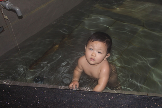 每次回台北, 總免不了要跟阿媽一起上陽明山去貝訪姑婆. 這次當然也帶翰翰去. 而且也讓他跟我一起在姑婆家泡溫泉. 以為他會怕, 沒想到他玩到不想起來. 一直在水裡走來走去, 佷忙的樣子. 在泡湯的當時, 外面可是風雨交加, 讓在泡湯的我們覺得好幸福. 有冬天真好. 回到林口的家, 山上也好冷, 跟妹妹借了一些衣服, 讓翰翰也感受一下冬天的滋味.