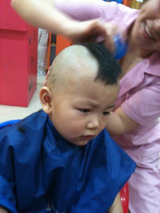 離上次剃光頭才三個月, 但因為翰翰非常怕熱. 右邊的頭皮被自己抓傷,一整片都是傷口。星期六要上音樂課,所以等到星期日去Harbourfront專間剪baby頭髮的店,再次剃光頭。 還好,翰翰的頭型很適合光頭,還蠻好看的。也很慶幸翰翰給別人剪頭髮都不會怕也不會哭。會靜靜坐著玩著方向盤。幫他剃頭的阿姨還故意留中間的頭髮變成龐克頭要我們拍照,最後才剃光。不過,翰翰還真不適合走龐克路線。