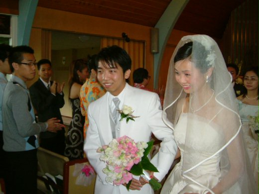 當燈光暗下,結婚進行曲響起,我們看著自門口緩緩進入的璧人,白色的薄紗襯著新娘皮膚白皙高挑,而瘦長的新郎倌更讓我們感到他們兩位著實比相片中美多了,一邊討論著男的帥女的美的話題,照片原來還是不太準的。正當我們陶醉於他們艷光四射中時,突然看見他們身後出現的另一對新人,才恍然大悟,原來,我們都認錯了。先前的金童玉女原來是他們的伴郎伴娘,這對幸福洋溢的情侶才是今天真正的男女主角。這真是天大的誤會呢!原來迷糊的我們兩人都認錯了,不禁抱著狂笑不止。