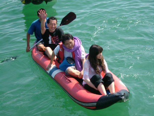 早上跟著划小舟在島周圍的蝙蝠洞探險。一邊划到周圍偏遠的無人小島。完全不受人類污染的美麗小島上,數得清的人們在沙灘上恣意的玩耍著,曬太陽、游泳、划小舟等。