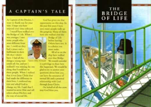 在狂拍著船上四週的設備後,經過一陣難耐的熱風,低頭看去,原來是屬於忠僕號的機艙,熱烘烘的機器持續運作著,維持著船艦的能源。短短30分鐘過去,在意猶未盡的狀況下,卻得離開美麗的忠僕號。和藹的船上義工發著屬於他們準備好的參觀憑證 "The Bridge of Life",裡頭記載著船長的話(A Captain's Talk),以及聖經裡神聖的章節。