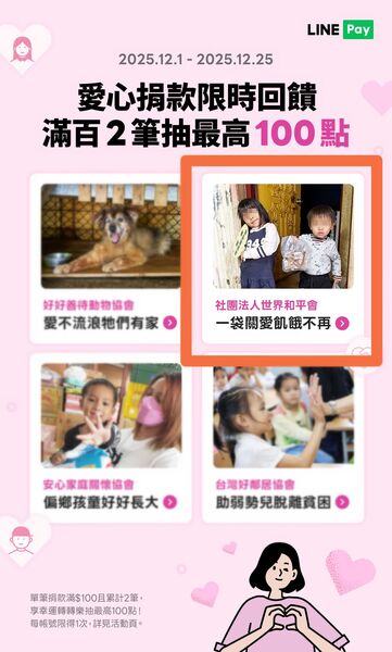 12/1-12/25期間,於LINE Pay愛心捐款專區、捐款單筆滿100元且累計2筆,享幸運轉轉樂機會,抽最高LINE POINTS 100點!搶救受飢兒,有您就行! 冷冷的天,即刻前往捐助支持世界...