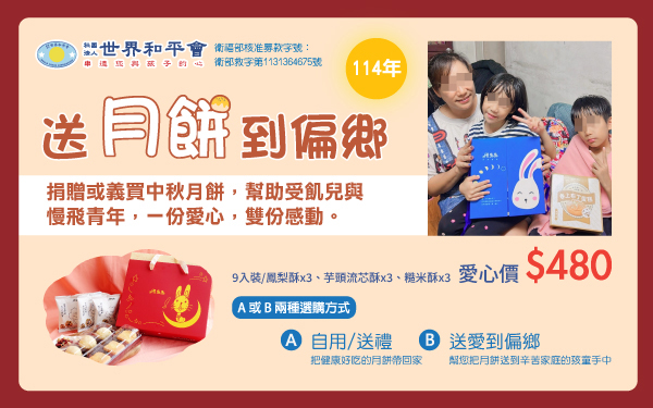 114 年送月餅到偏鄉 世界和平會長期服務偏鄉貧童與受飢兒,立達啟能訓練中心則持續照顧 18 歲以上的心智障礙者,今年是和平會與立達第九年一起推廣慢飛青年用心製作的美味月餅。如果您願意將月餅轉贈,...