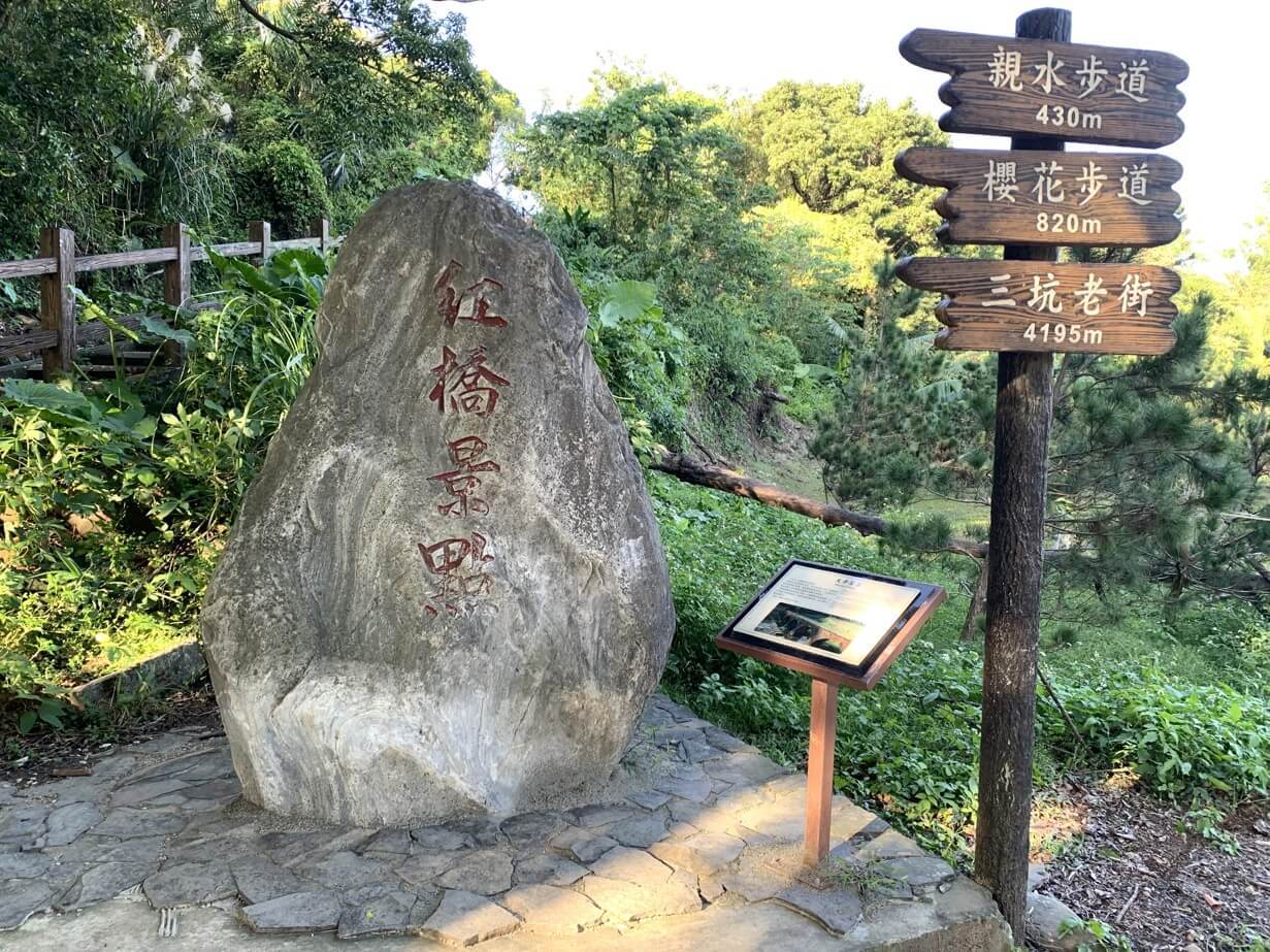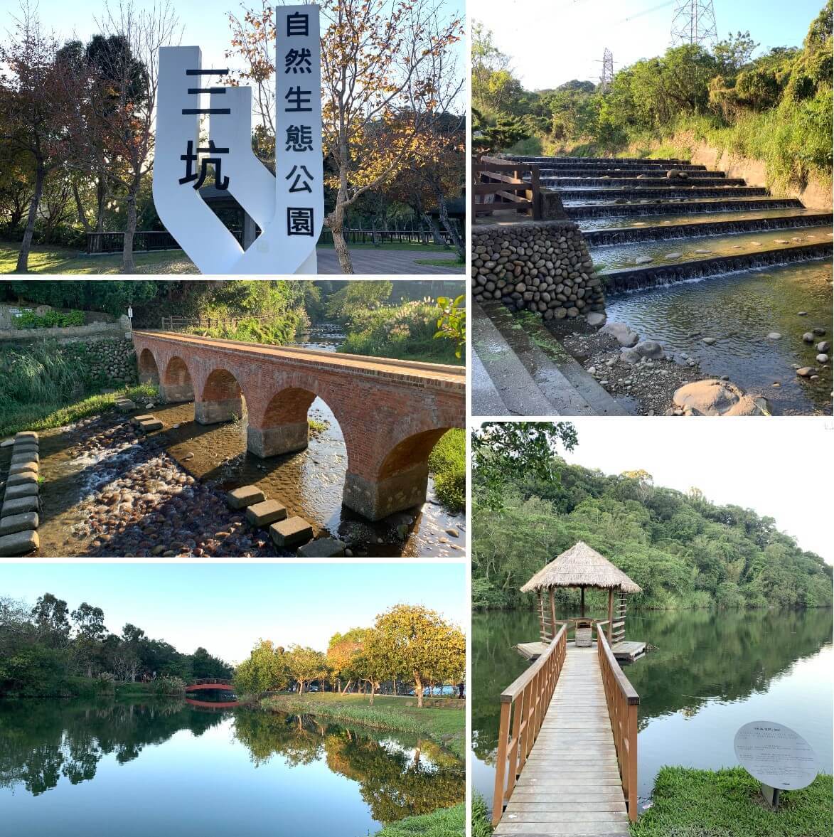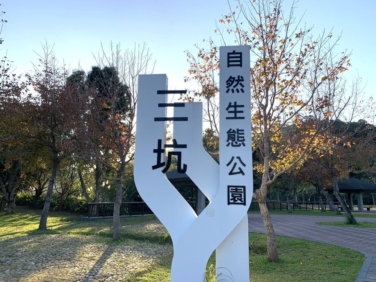 ↓來到「三坑自然生態公園」。日據時代這裡曾是「大漢溪」繁忙的渡船頭,後因河道的淤塞,而宣告水運的沒落。經重新設計規劃,引入「石門大圳」的水源,逐漸改善植栽綠化,打造成波光瀲灩、蓊鬱青翠的3.8公頃自然生態公園。