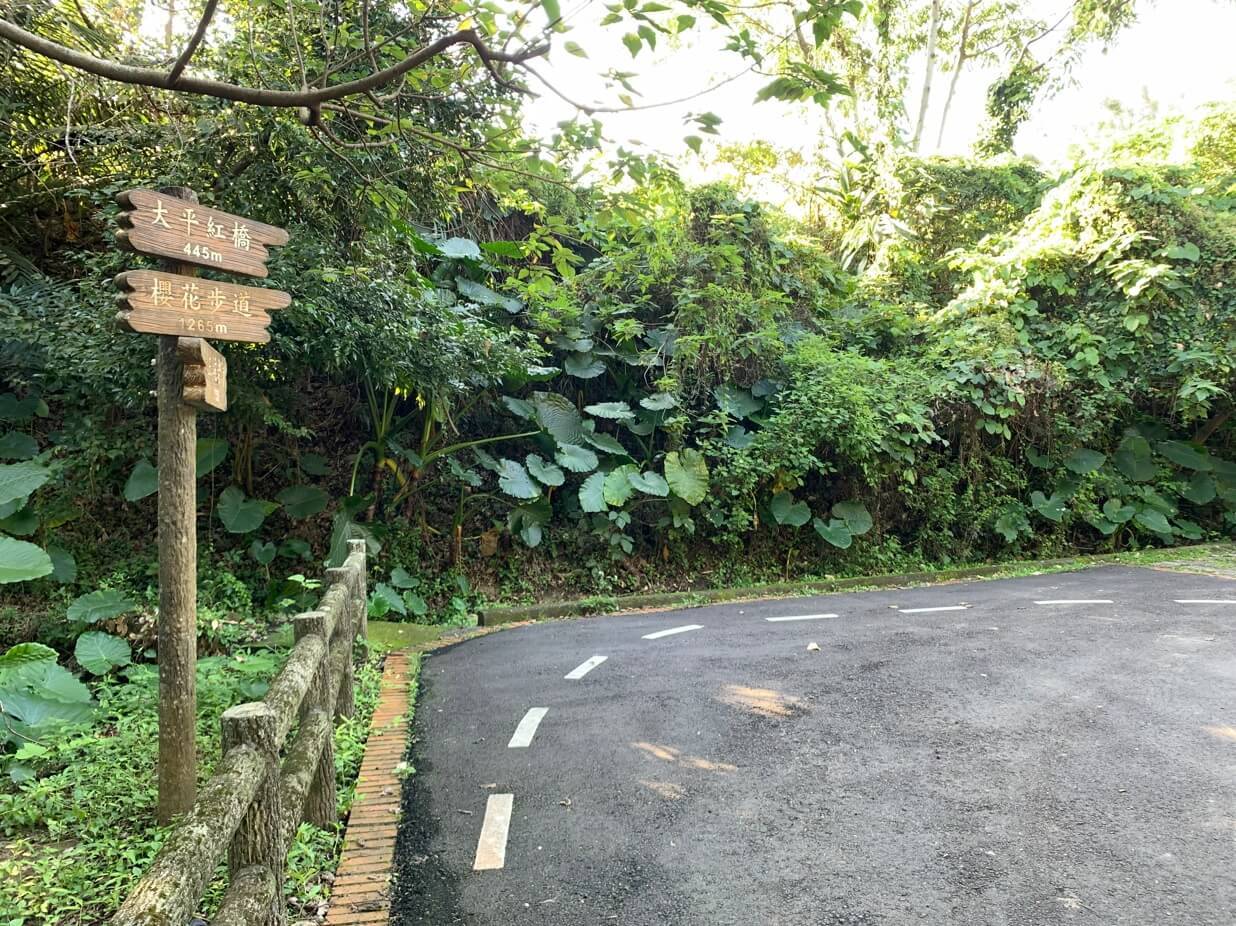 ↓到「大平紅橋」還剩445公尺,前方還有「櫻花步道」,不過目前不是櫻花季,我們今天不走「櫻花步道」。