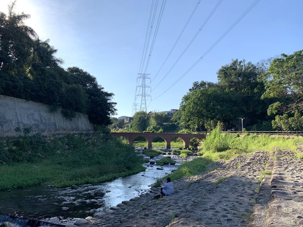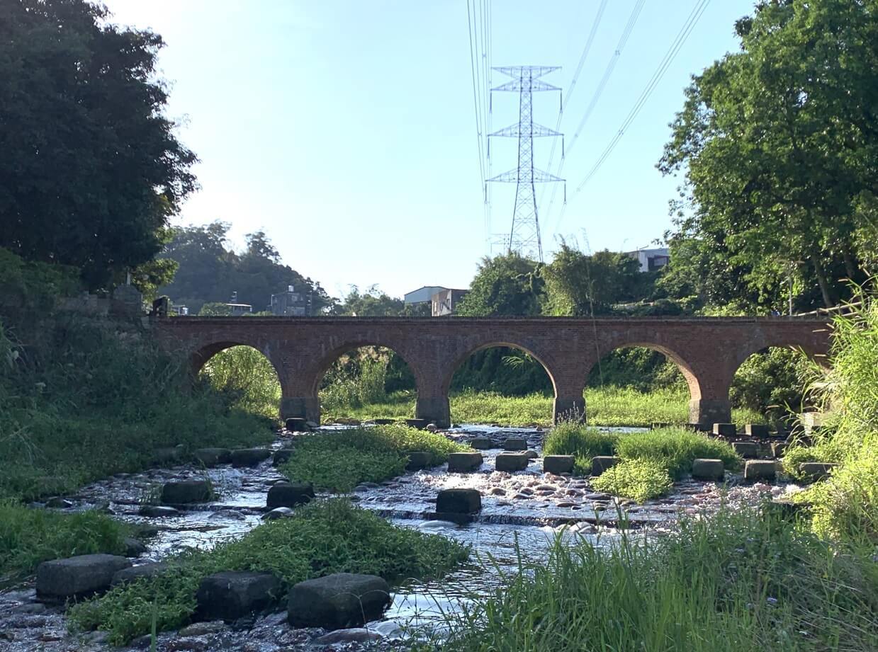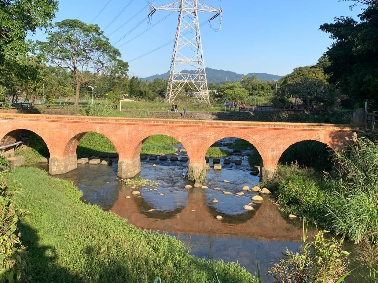↓紅磚橋身倒影在「打鐵坑溪」,朱紅色的橋身,映照溪流綠野,真是美景如畫!