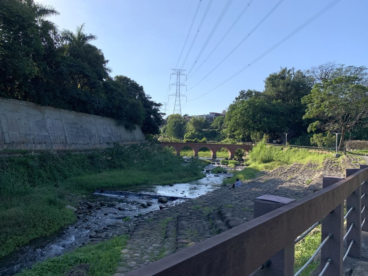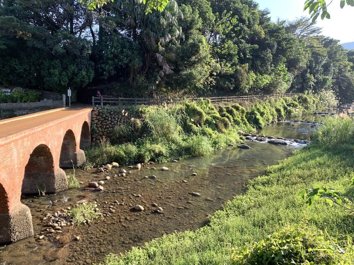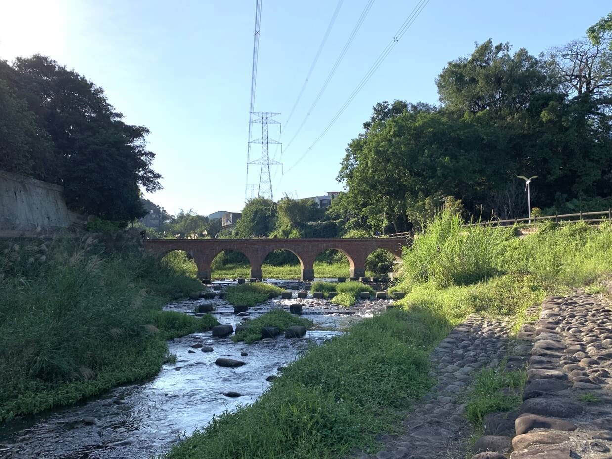 ↓紅磚橋身倒影在「打鐵坑溪」,朱紅色的橋身,映照溪流綠野,真是美景如畫!