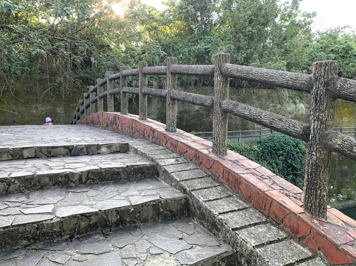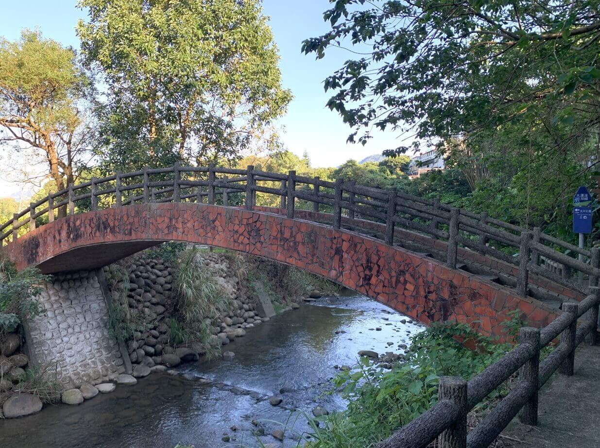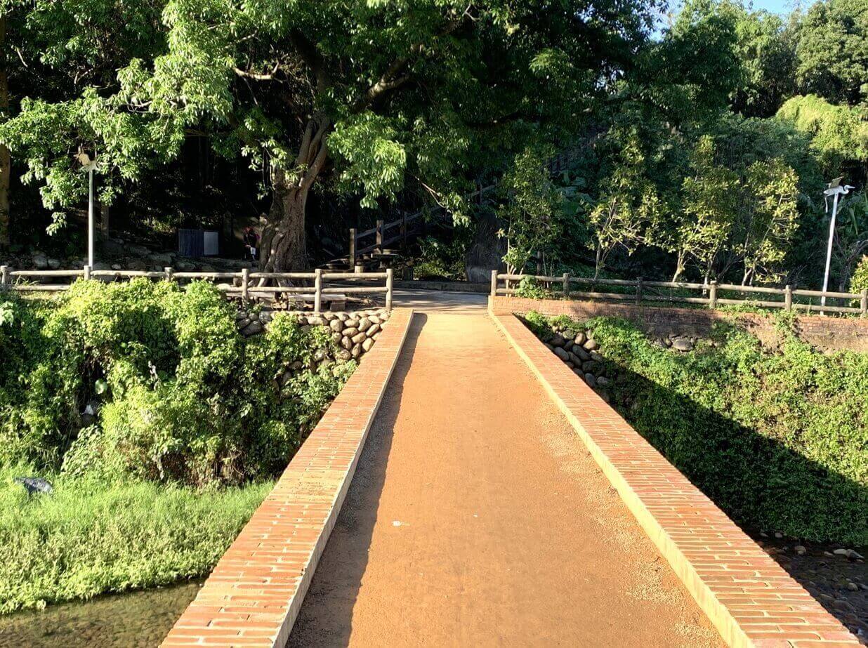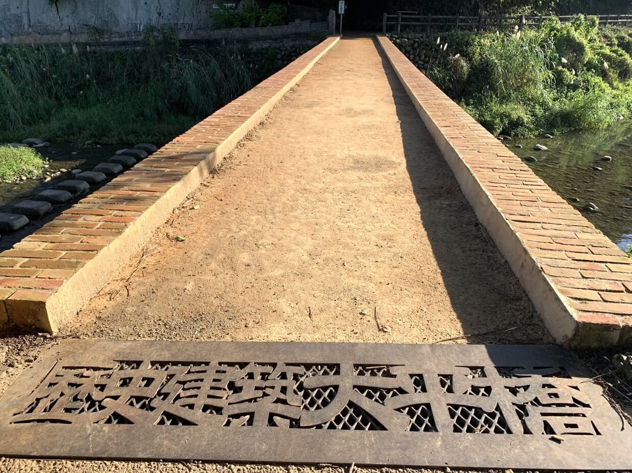 ↓來到這裡,一定要走一趟這歷史百大建築的「大平紅橋」。橋邊圍牆僅約10公分高,小朋友來此,要小心一些。反倒是有不少遊客來此,坐在橋上(腳懸空)拍照,橋離溪底其實才高約3公尺,約當一層樓高。