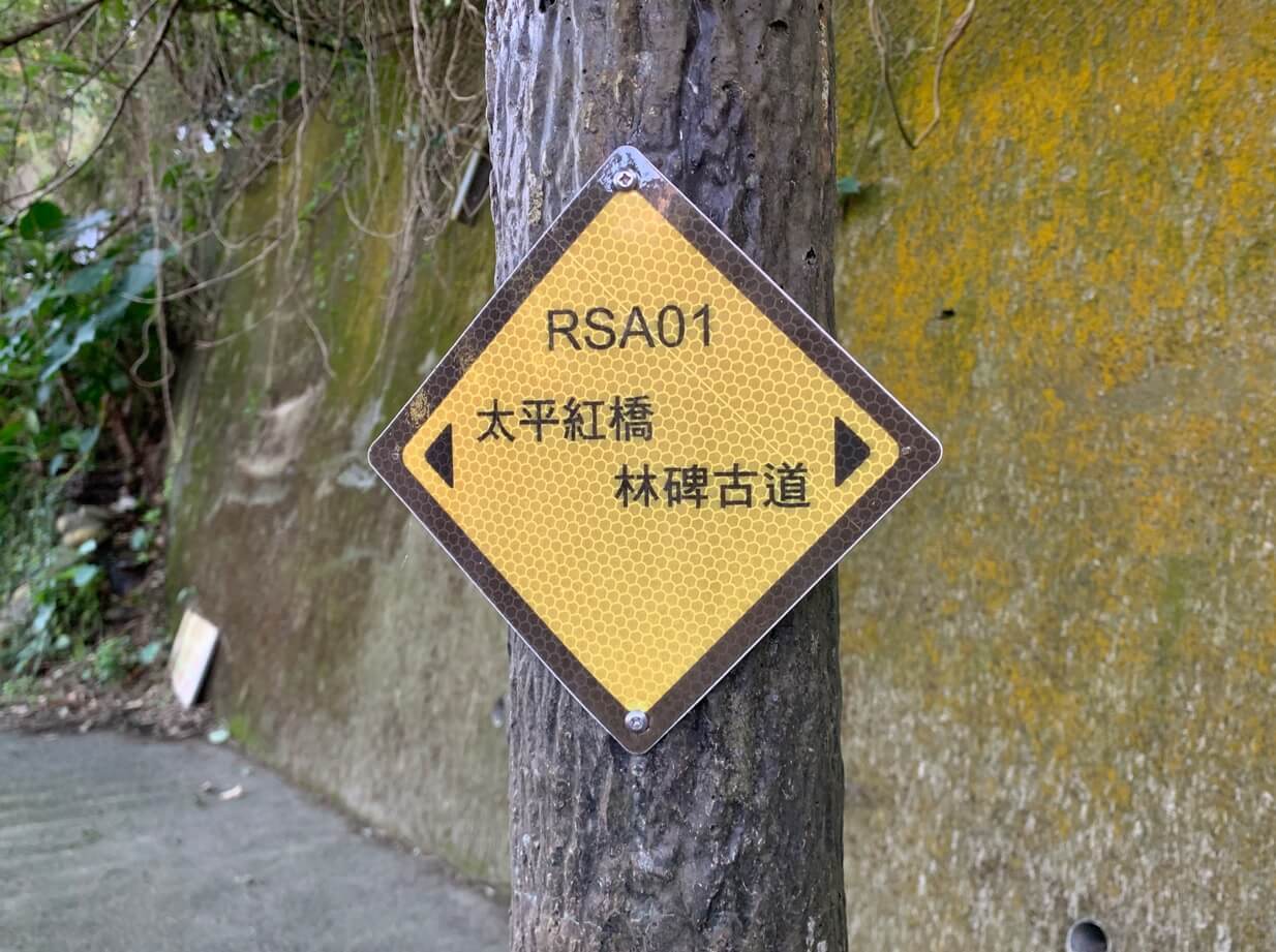 ↓我們現在走的這一段從「大平紅橋」經「櫻花步道」到「林碑古道」,是過往【樟之細路】的一段,代號「RSA01」。【樟之細路】總長380公里,其中主線長 220 公里,起於<桃園龍潭>,止於<台中東勢>,約當現行【台3線】一帶,是客家庄數百年來內山發展的歷史路徑。