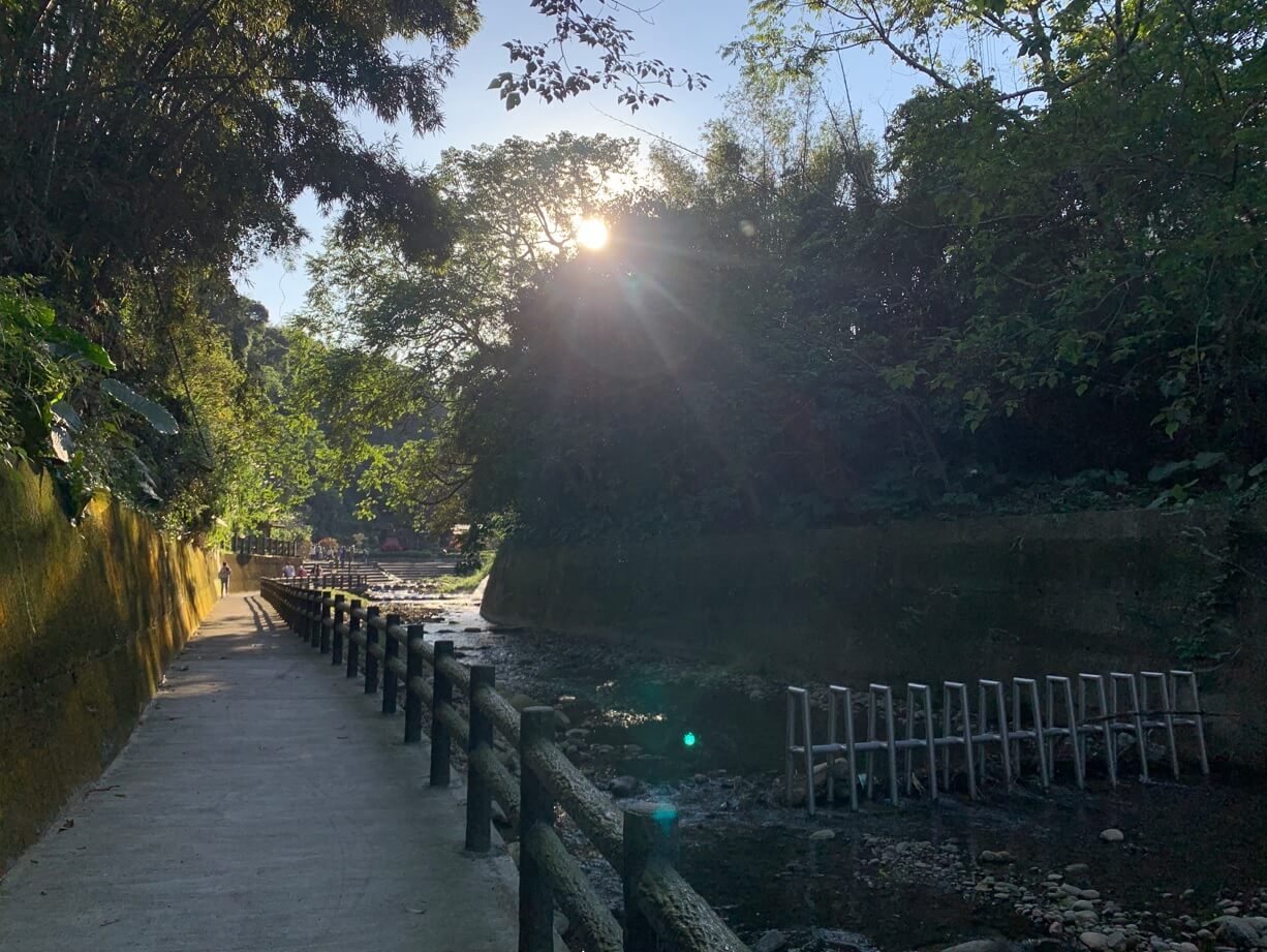 ↓這一段溪流,不僅有擋土石塊,還有現代化的不鏽鋼擋土架。前方樹梢光芒,若不說時辰,還以為是日出美景呢!