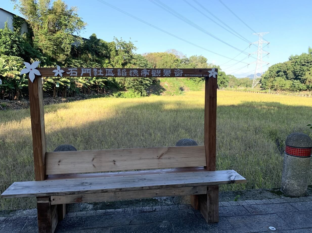↓過了紅色拱橋,有一座「石門社區稻浪亭觀景窗」,只要季節對,背後黃澄澄的稻浪,是很好的拍照聖地,可比台東池上的稻浪。
