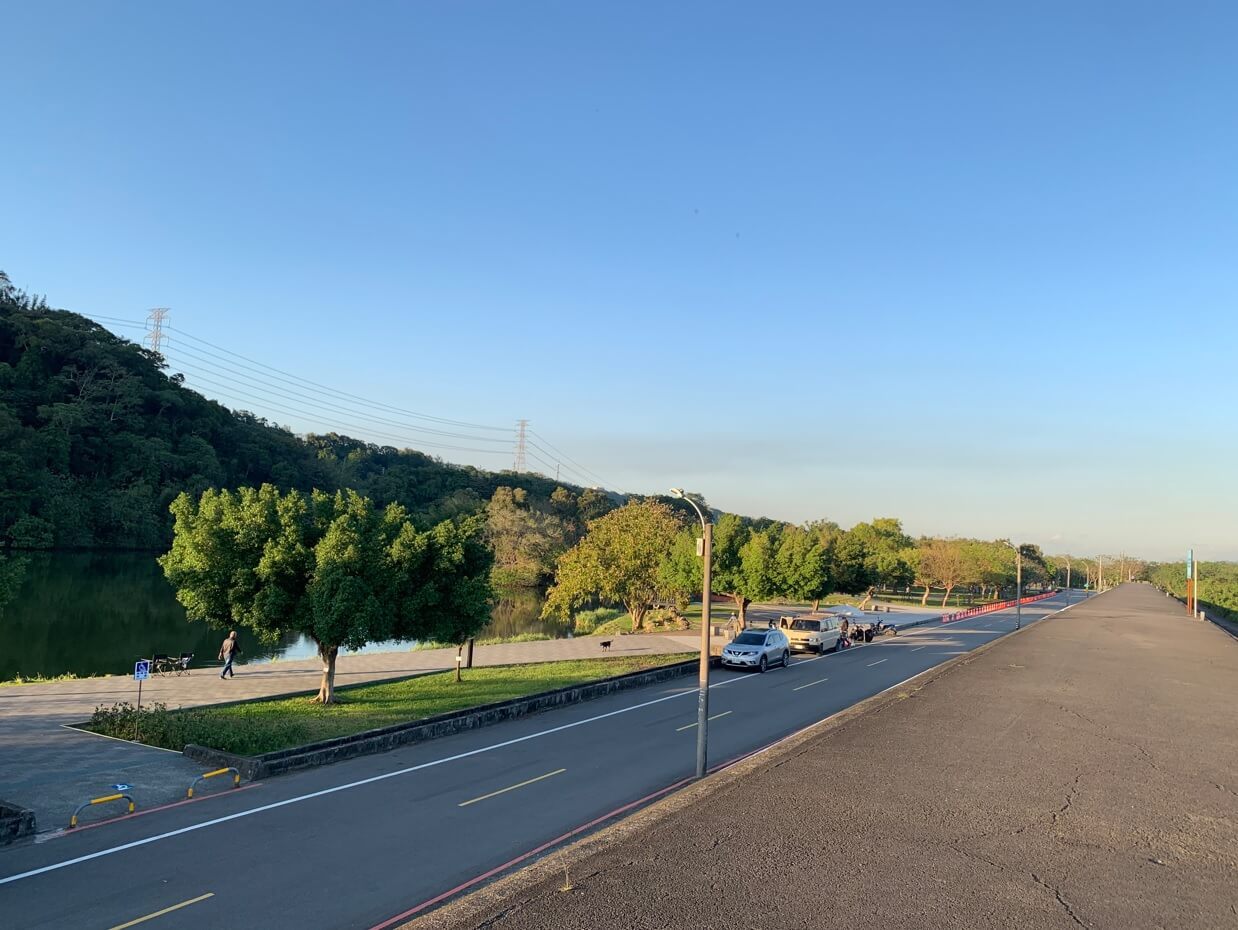 ↓離開河堤,回到公園,馬上映入眼簾的是翠綠山色倒映在湖心的生態池。