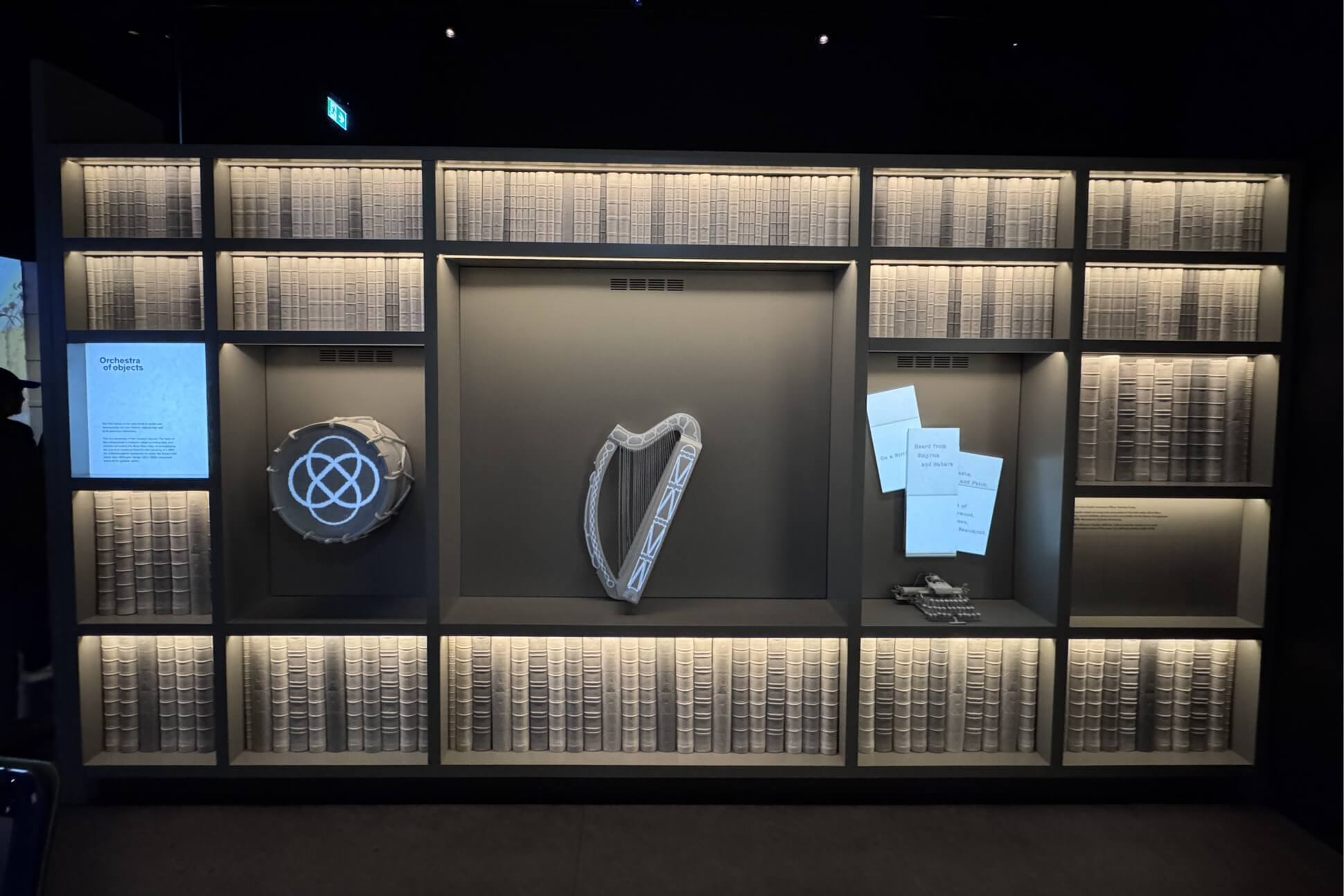 ↓一進到展覽室,就看到這一排木櫃牆,咦?這一把不就是Brian Boru Harp豎琴的縮小版嗎?