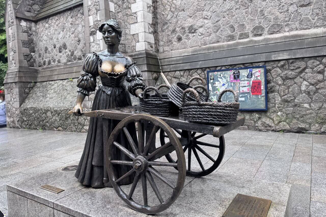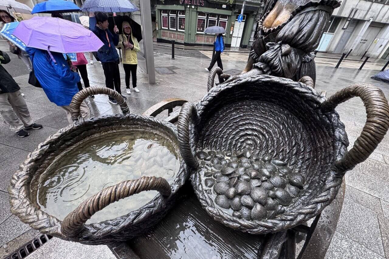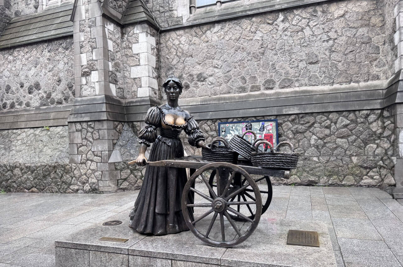 ↓《Molly Malone(莫莉瑪儂)》是一首流行於都柏林的民謠,歌詞講述一位女性魚販在街頭叫賣維生,辛勤工作卻染病身亡的故事。雕像中,少女推著一輛裝滿魚貨貝類的手拖車,神情抑鬱苦悶,正符合這樣的人物背景。