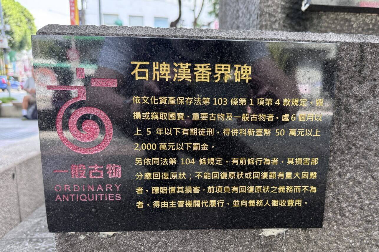 ↓這座石碑,名為「石牌漢番界碑」,已被列為【一般古物】,也是「石牌」地名的由來。是啊!以前怎麼都沒想過為何這個地方叫做「石牌」?事實上,捷運淡水線上的許多站,如:雙連、劍潭、唭哩岸等,其地名都很值得探究。