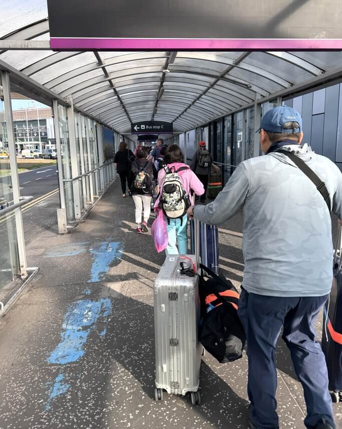 ↓飛機上好好地補了眠,飛機約於11:15抵達倫敦的Luton機場,也是直接走下飛機到出口。提領行李時,有團員的行李箱被摔壞了輪子,經向航空公司申報理賠,耽擱了約一個小時的時間。