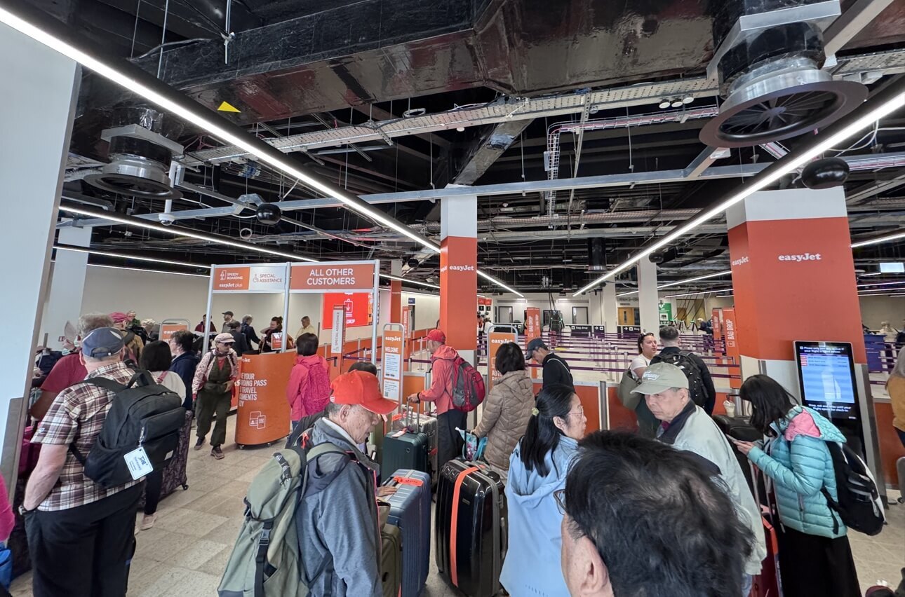 ↓雖然蘇格蘭(愛丁堡)飛英格蘭也算是國內班機,不過,因為我們都有大行李,也要安檢,因此,要花不少時間,領隊引領我們自行報到、列印登機證。