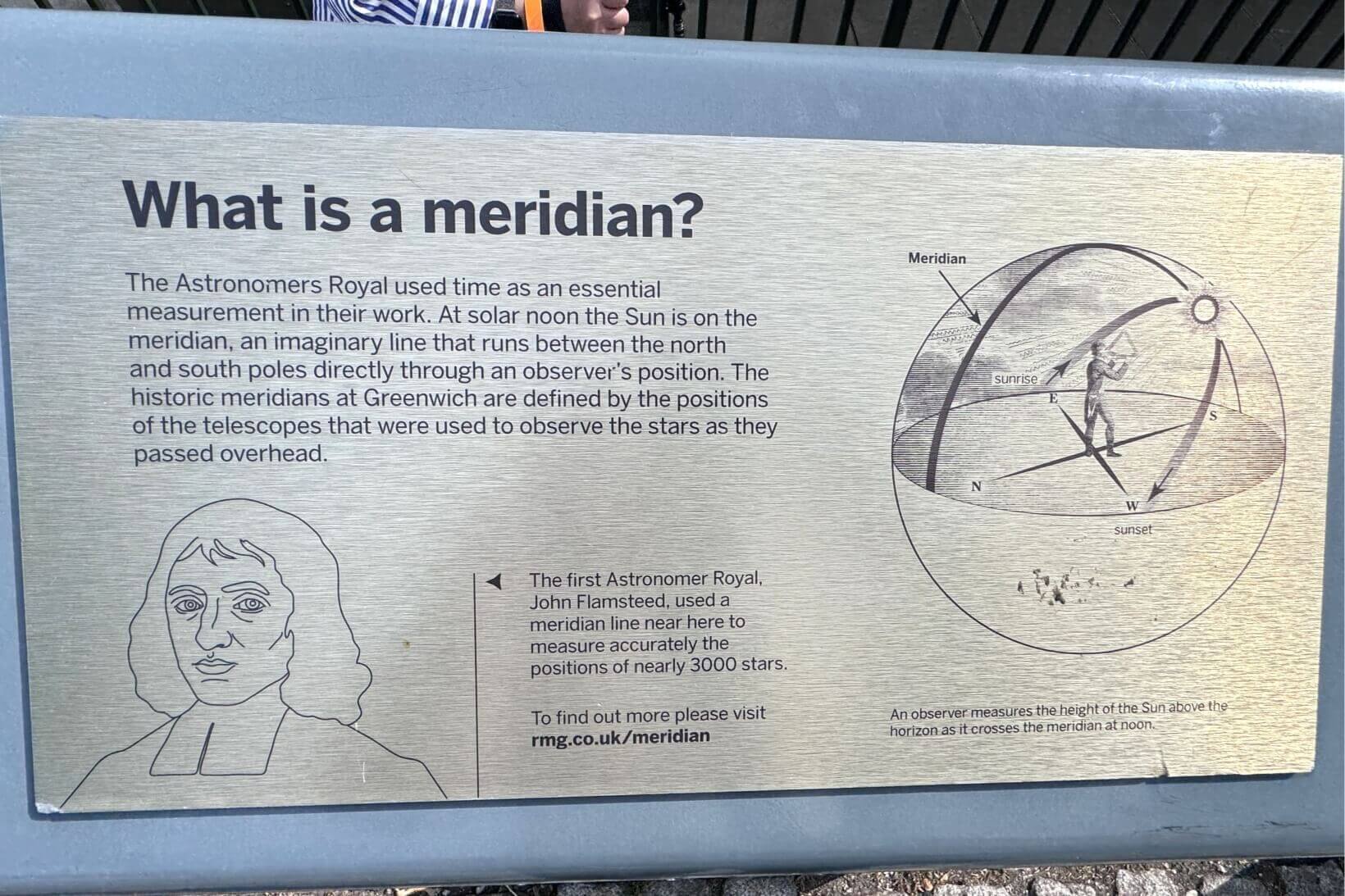 ↓什麼是「子午線Meridian」?在正午時分,太陽位於連結南北兩極間的一條假想線上,這條線就被稱為子午線,皇家天文台便是依子午線觀測星星。第一位皇家天文學家John Flamsteed,便因此精確地測量了近3000顆恆星的位置。