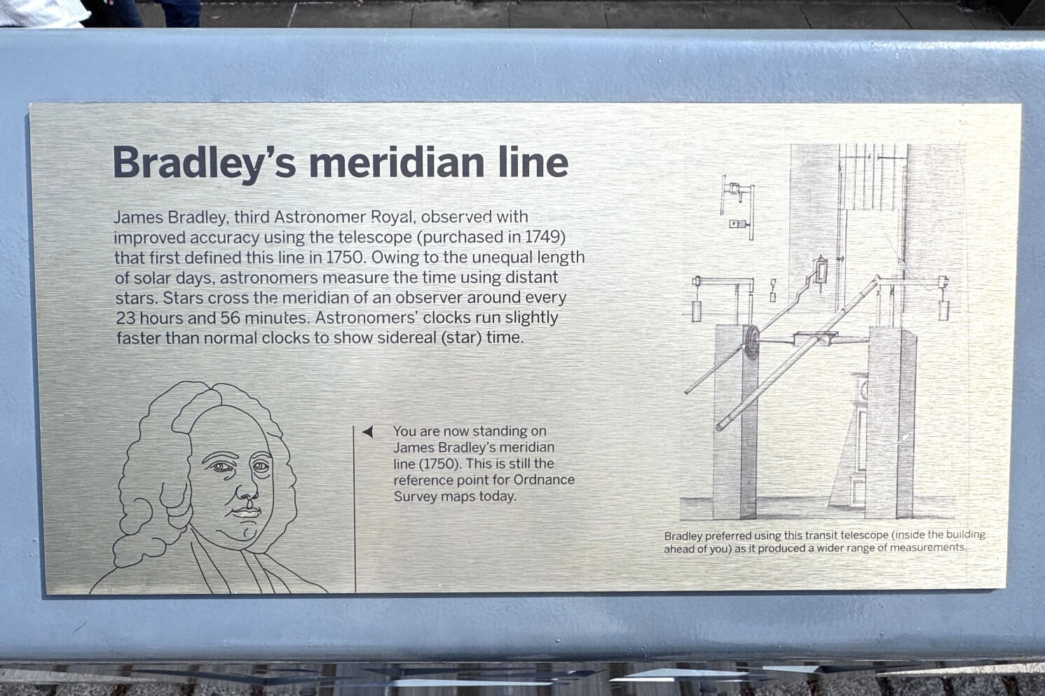 ↓皇家天文學家James Bradley於1750年首次使用望遠鏡定義了子午線,從而提高了觀測的準確性。由於太陽日的長度不等,地球每日自轉約23小時56分鐘(平均誤差應為1分鐘)就會穿過子午線,因而會有每4年一個潤年(多一天)。