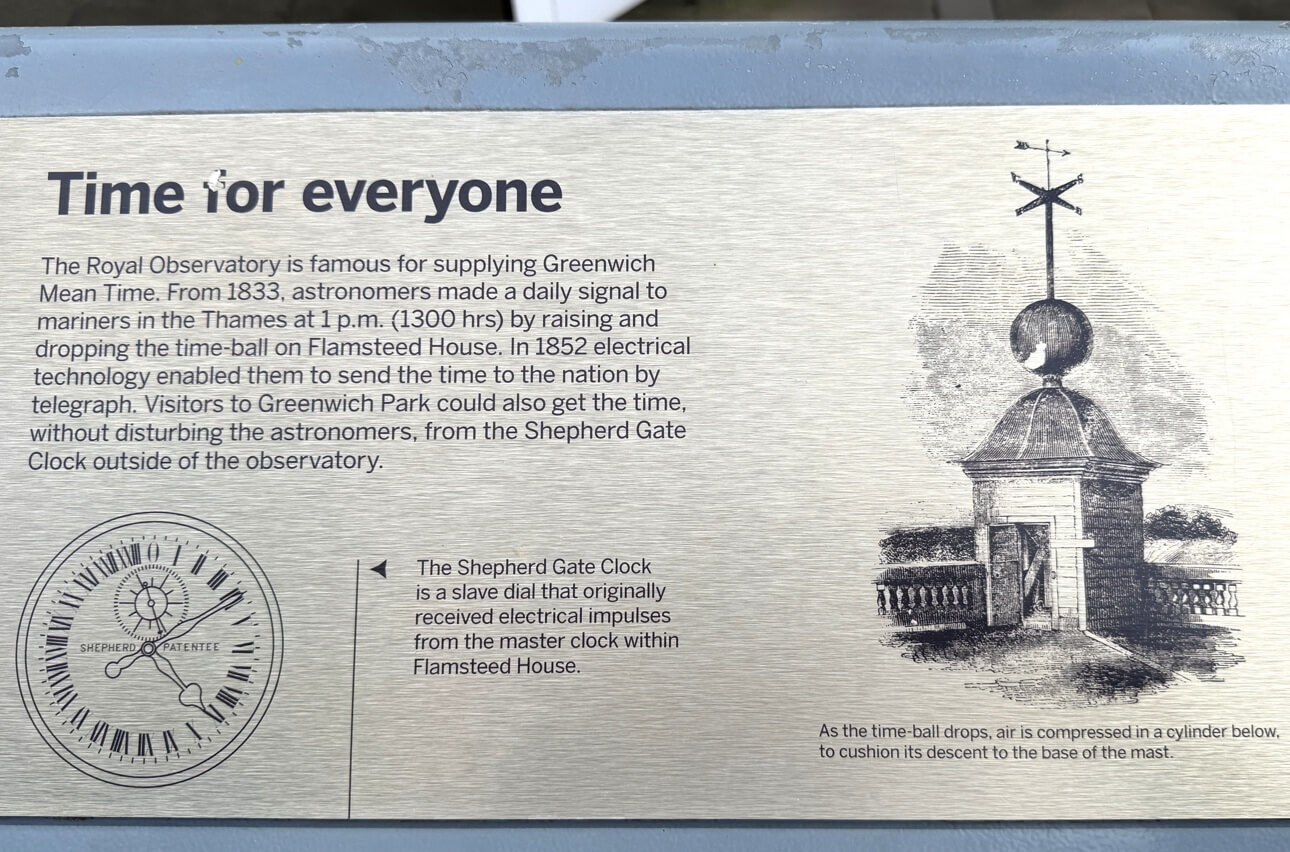 ↓皇家天文台從1833年起,天文學家每天下午1點會透過升降『時間球』,向泰晤士河上的船員發出信號。1852年,因技術提升而能夠通過電報將時間發送到全國,成為格林威治標準時間(Greenwich Mean Time, GMT)。