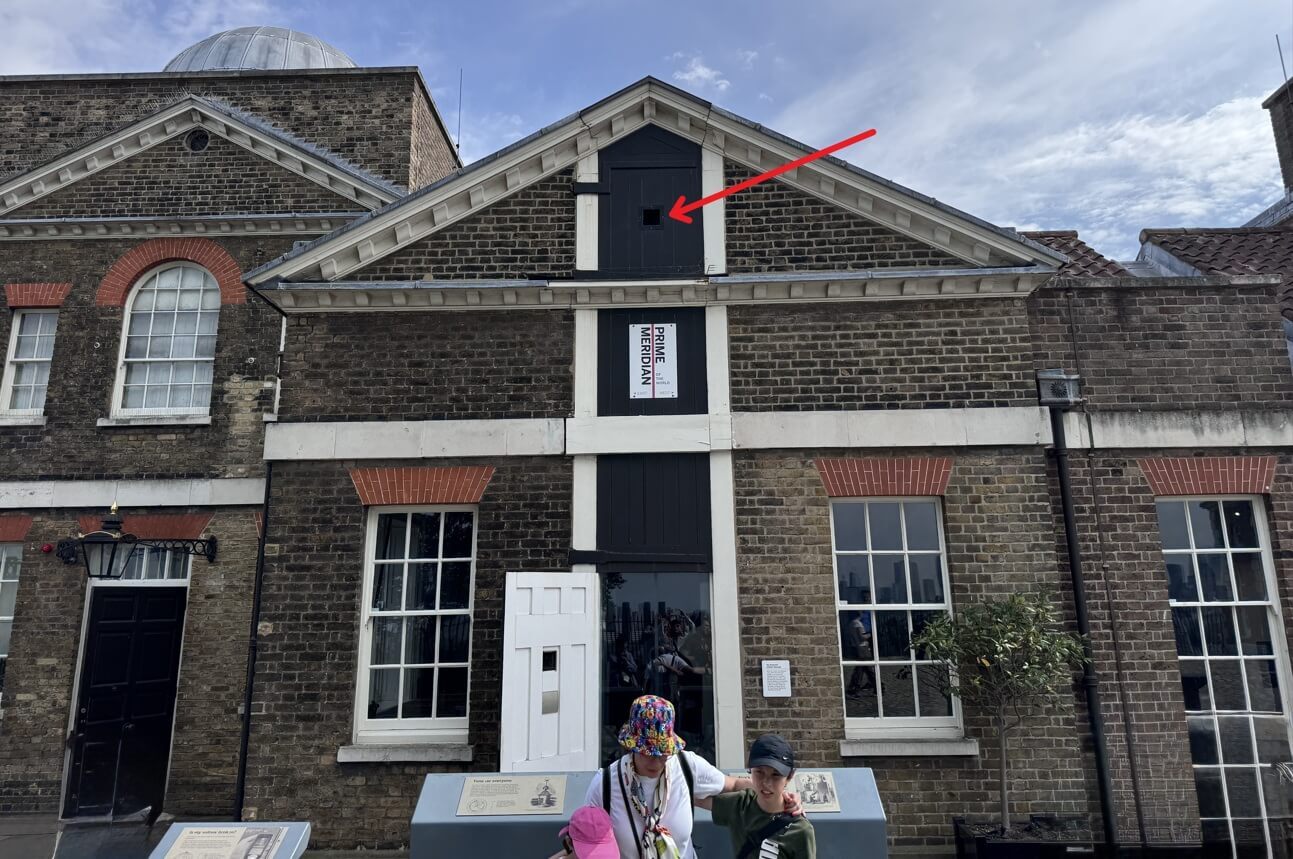 ↓在本初子午線後的這棟房子上,有一個正方形的小孔(如紅色箭頭處),據說每天夜間會射出綠色雷射的光芒,標誌著本初子午線,閃耀在倫敦的夜空中。我們沒在這裡待到晚上,無法見證這樣的光芒,可惜了!