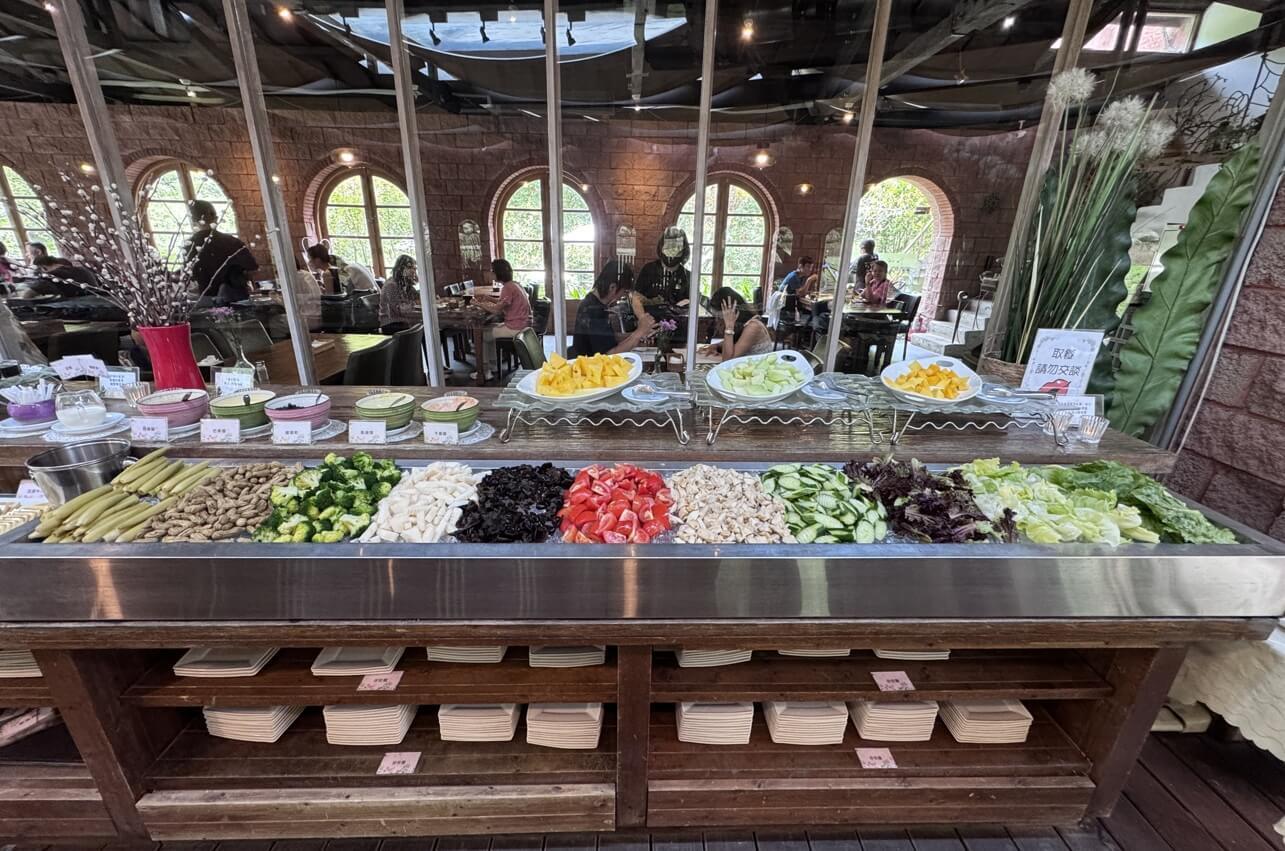 ↓餐廳假日提供排餐+自助沙拉吧,一進餐廳,便可看到沙拉吧滿桌豐盛的菜色。先看到的是生菜,有高級餐廳等級的羅勒生菜,上層有高級水果(芒果、水梨、西瓜等)及各式沙拉醬。颱風過後菜價飆漲,來餐廳吃青菜(生菜)最划算了。