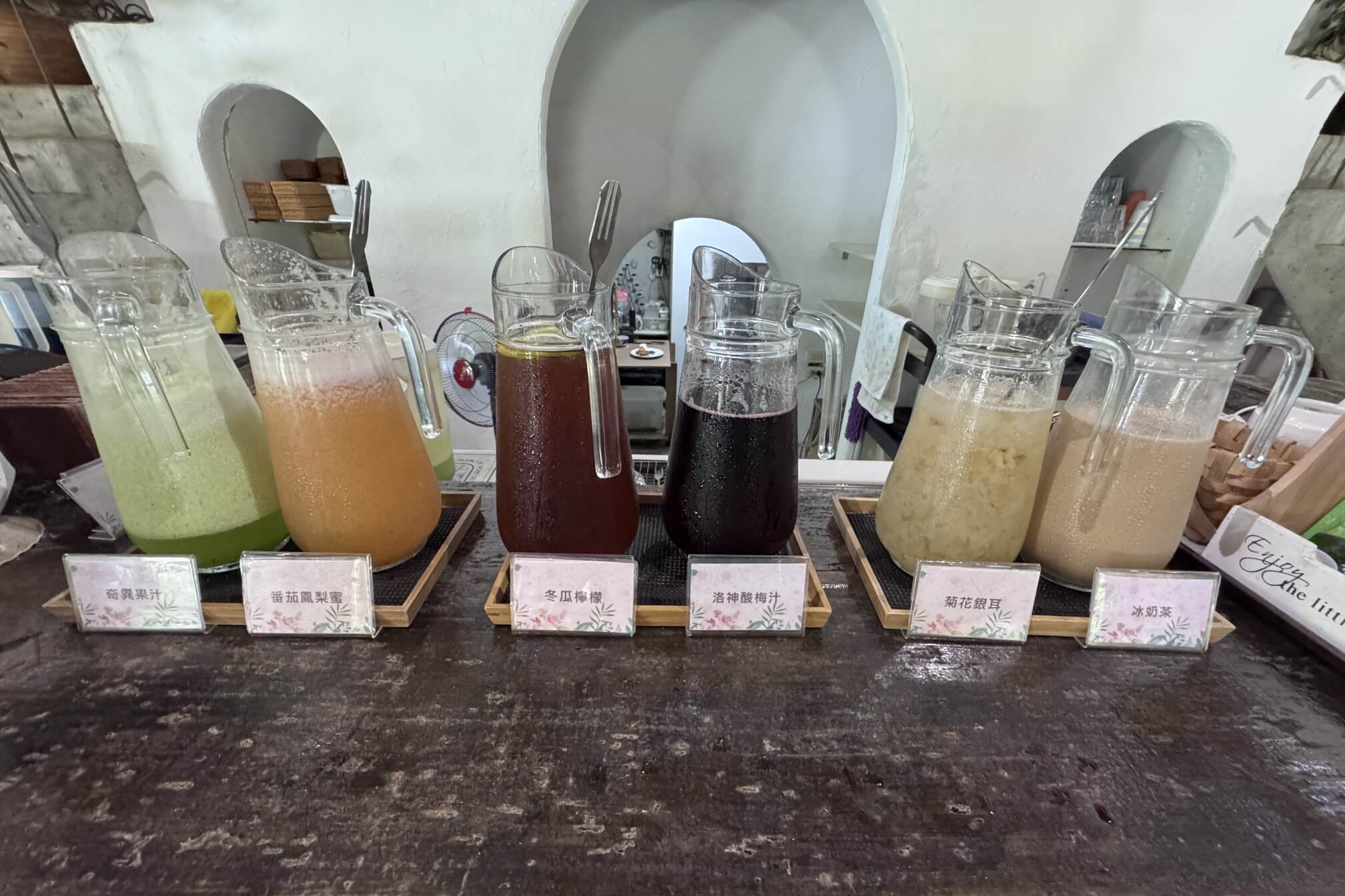 ↓樓梯下的這個櫃台,也是取餐區,除了咖啡外,還有六種不同口味的現打果汁、飲料。
