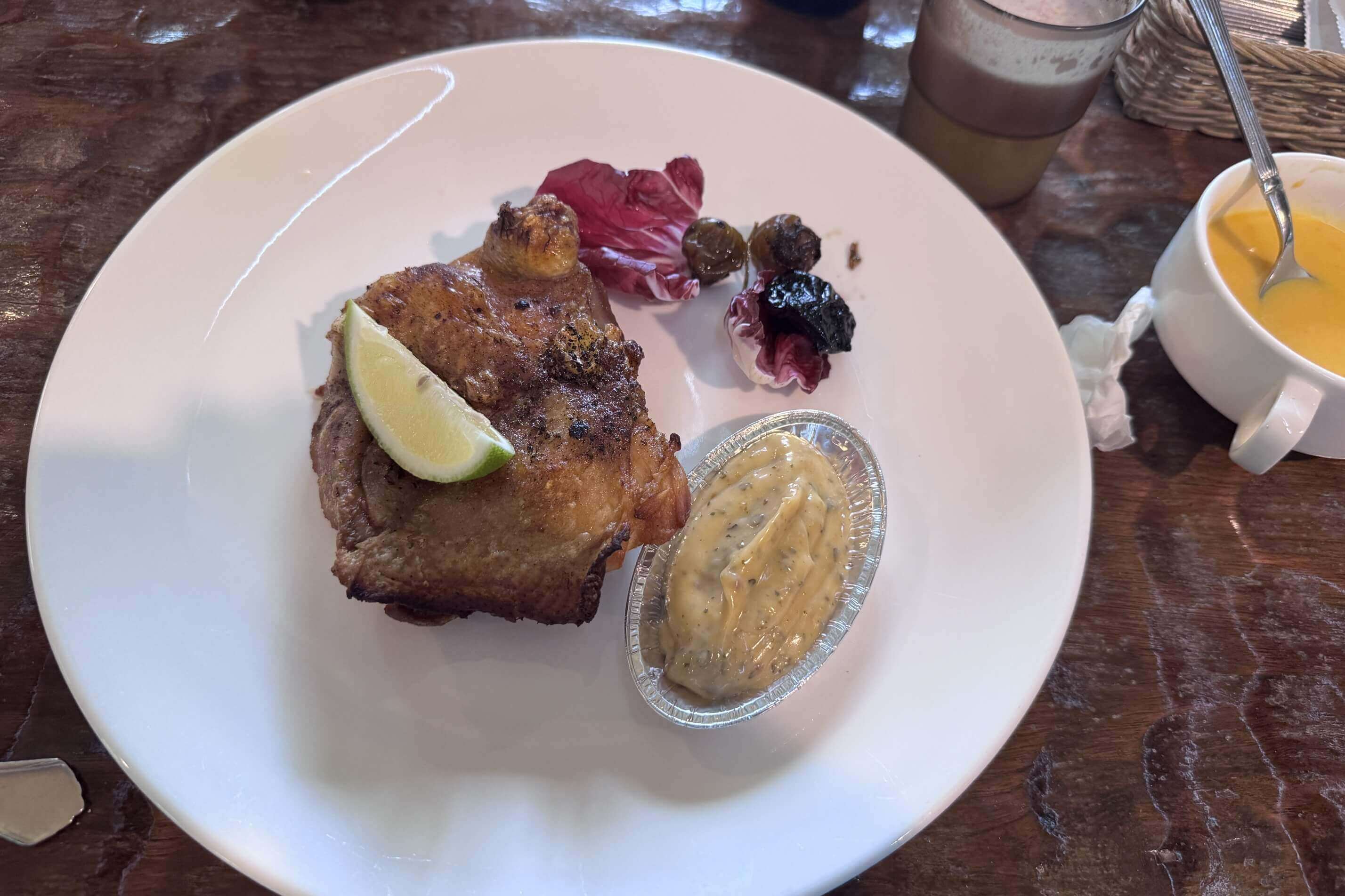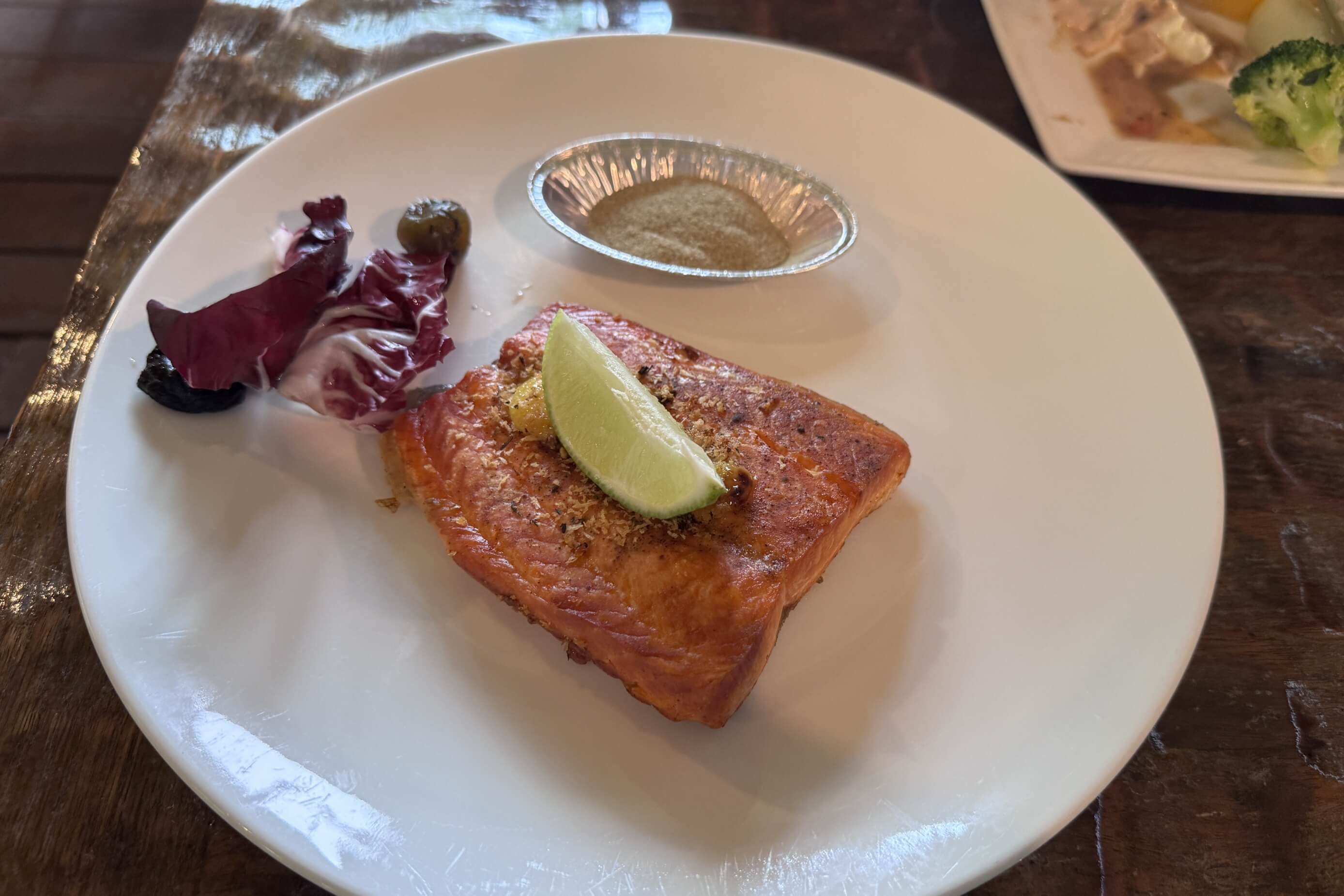 ↓我們點的主餐來了,雞腿排、鮭魚排,都有大餐廳的手藝;而沙拉吧的餐食,會不斷地換補不同的菜色,都有一定的水準。