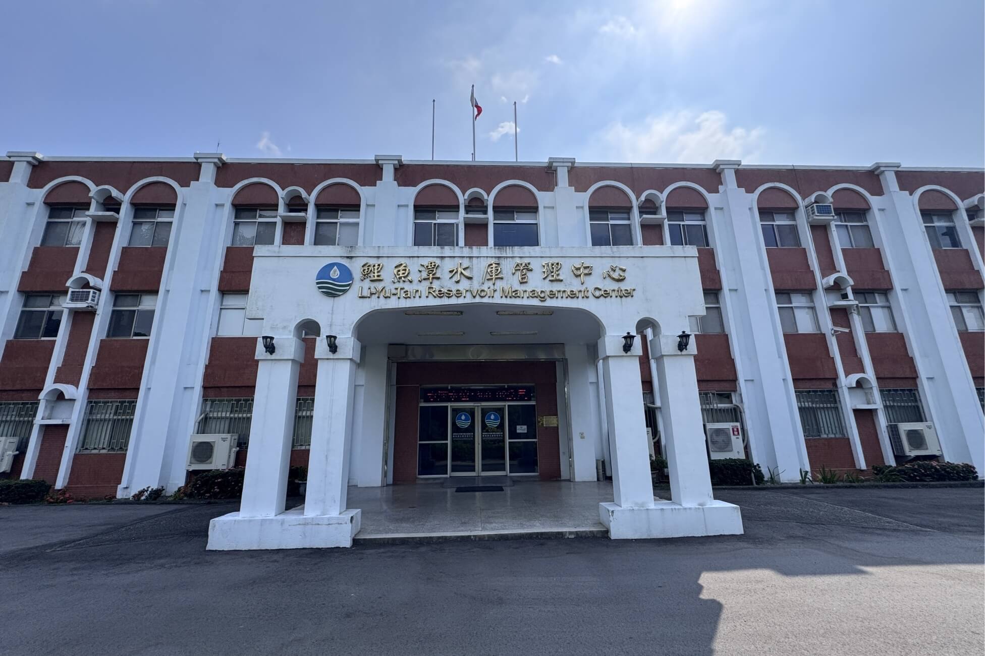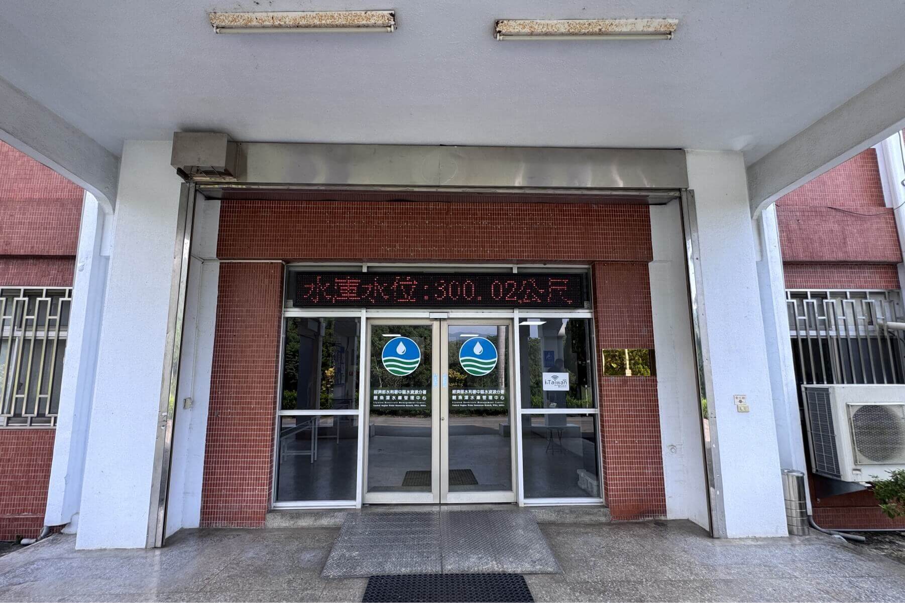 ↓管理中心的大門,顯示著目前《水庫水位:300.02公尺》,而鯉魚潭水庫的滿水位為300.00公尺,表示水庫目前正是溢流中。