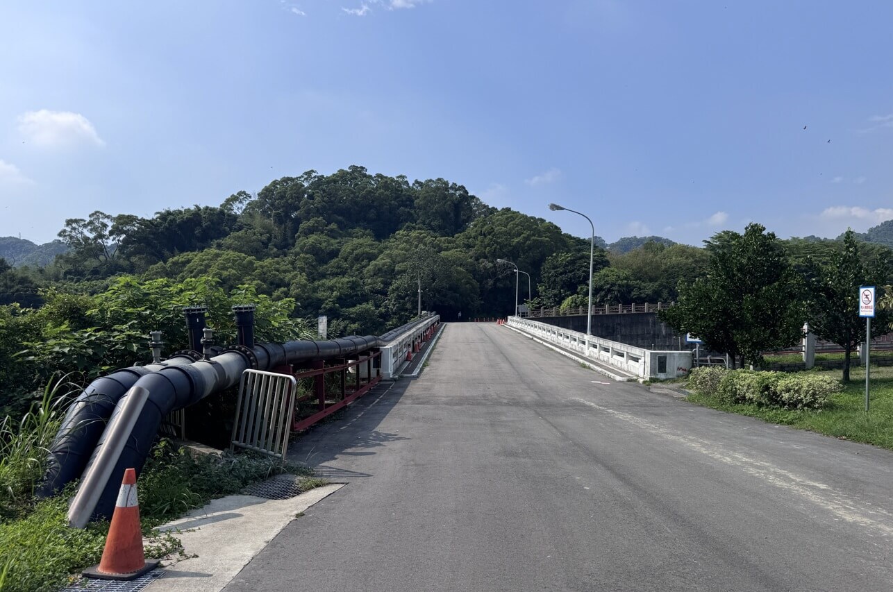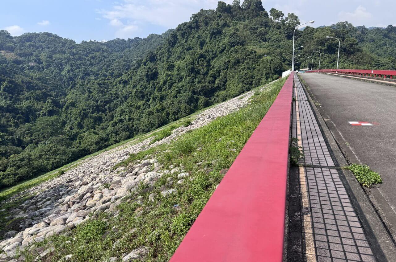 ↓洩洪道下面,可以看到剛剛所在的龍門橋,橋的上下兩側,是兩座貯水的後池堰。