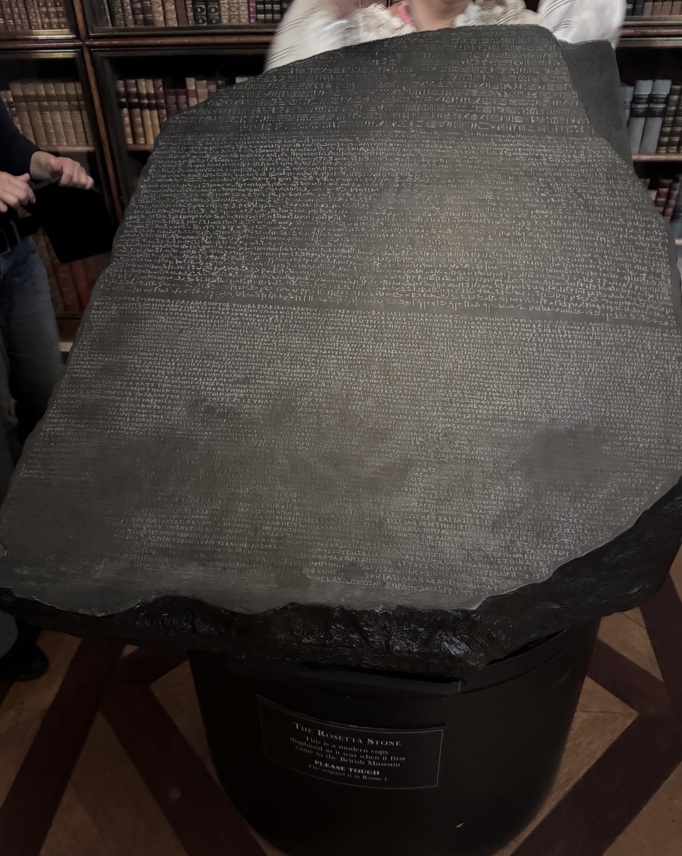 ↓這裡又有另一顆羅塞塔石碑。它是在1799年由拿破崙的軍隊在埃及羅塞塔地區 (現代的拉希德)附近發現的。後來在1801年,隨著法軍戰敗,這塊石碑被英國軍隊繳獲,並於1802年運來倫敦,而後成為大英博物館的鎮館之寶之一。