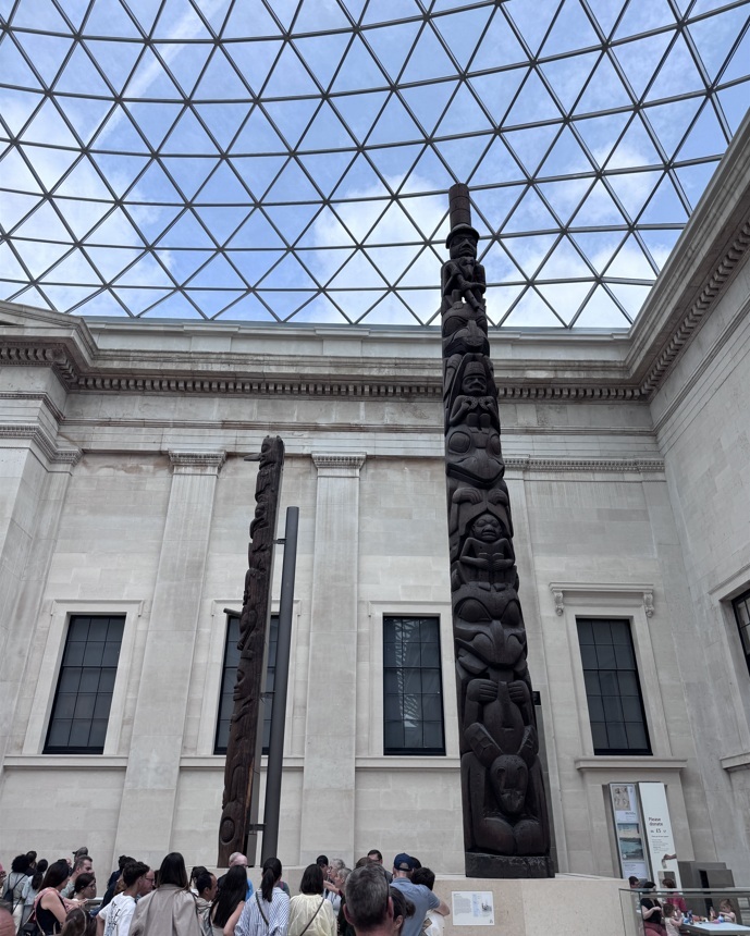 ↓前側大廳內的這兩根大型雕刻桿是圖騰柱,來自加拿大英屬哥倫比亞省(British Columbia)西北海岸的尼斯迦族(Nɪsɡɑ)和海達族(Haida),是大英博物館重要的美洲原住民文物收藏;以西部紅柏雕刻而成,用來講述族群、歷史和文化信仰。