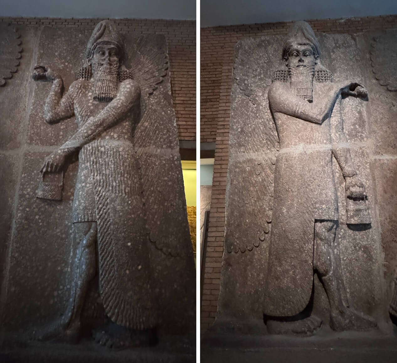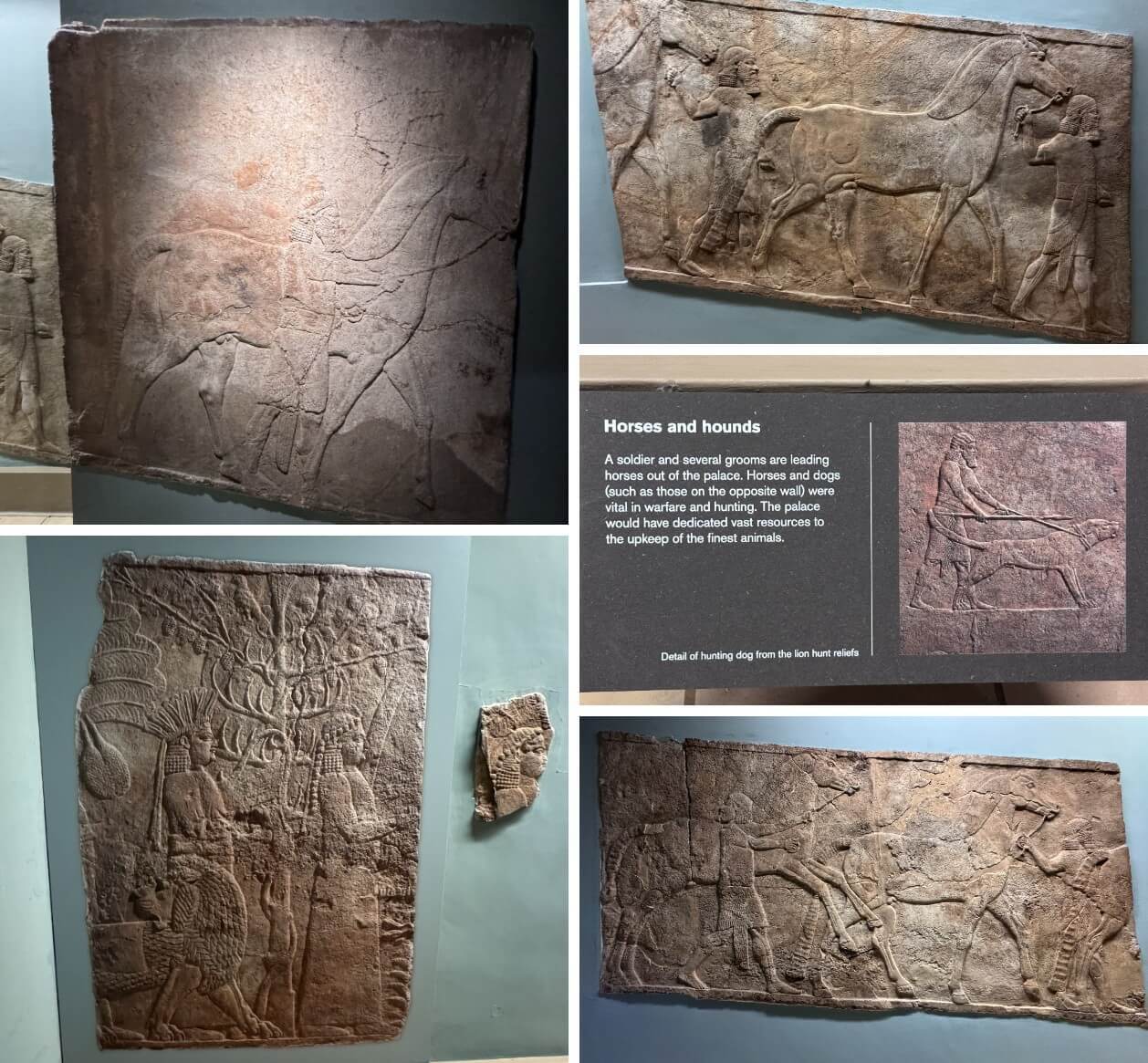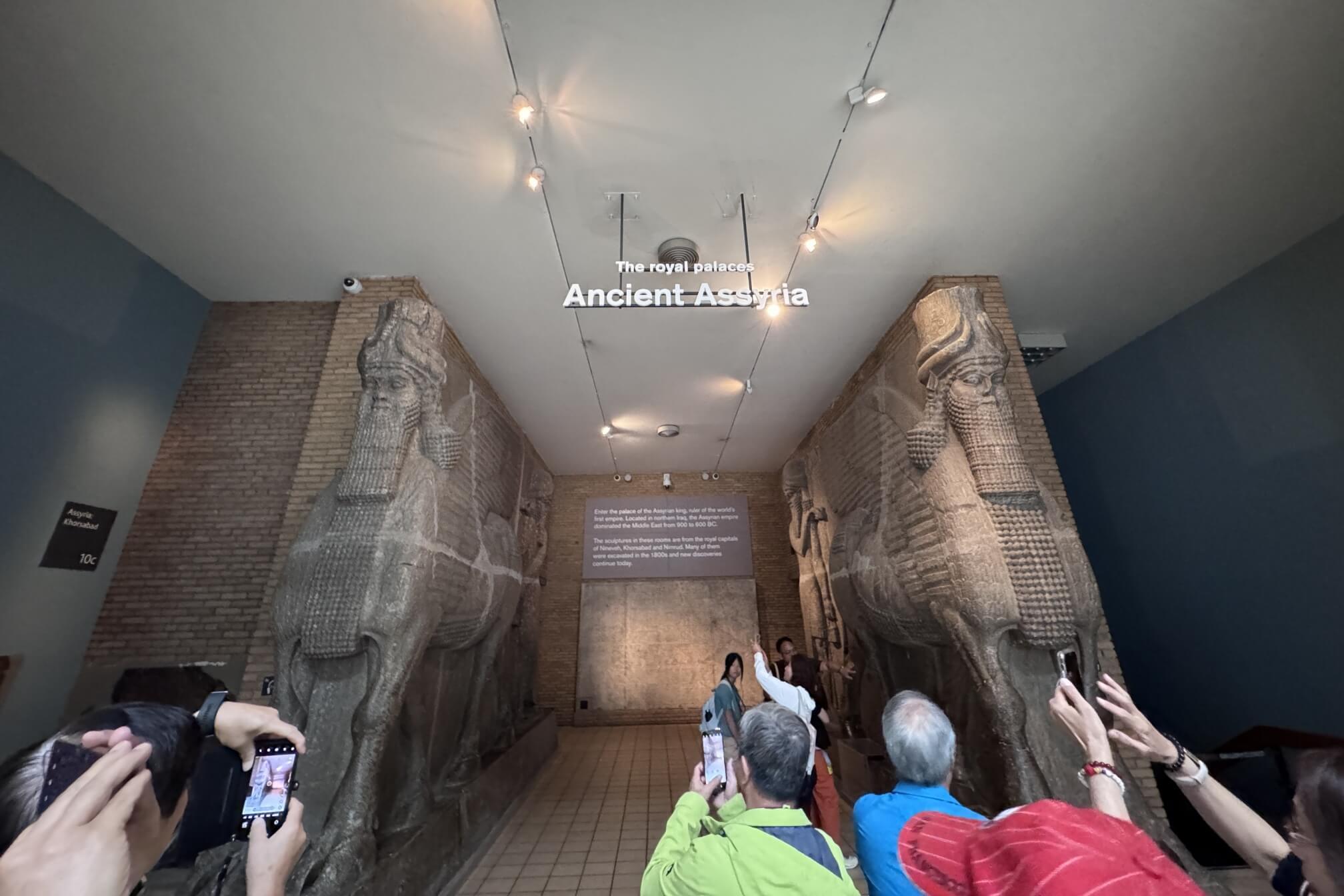 ↓前方雕像是拉瑪蘇(Lamassu),亞述(Assyria)的保護神,有著長翅膀的公牛或獅子的身軀、人頭,約公元前721~05年間,被安置在宮殿的入口處,以保護亞述國王薩爾貢二世(Sargon II)。當初因為太重,被切成四塊,從伊拉克運來英國。