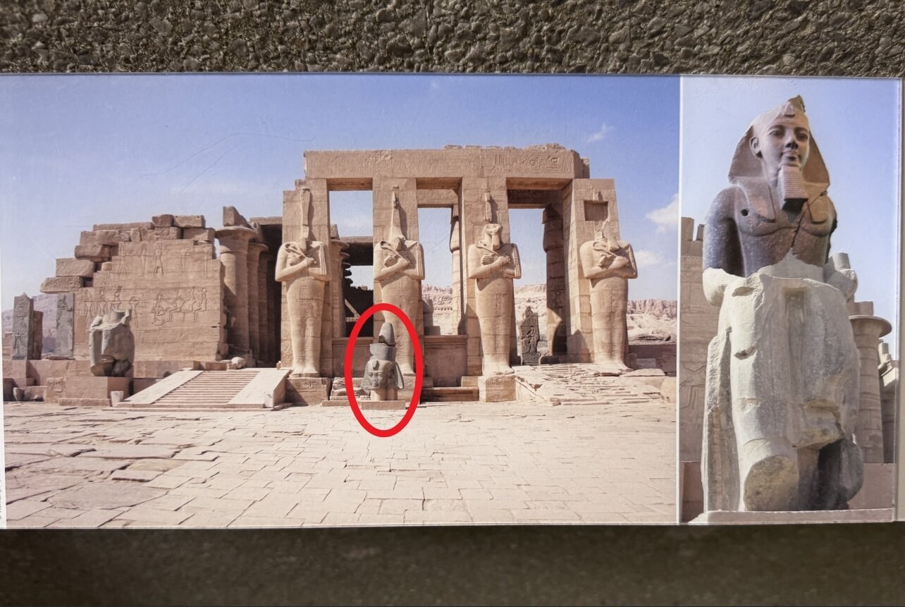 ↓它是最初位於「拉美西姆Ramesseum神廟」門口側翼的一對雕像中的一尊,另一尊雕像的頭部,目前仍然在拉美西姆神廟的門口,如紅色圓圈處。