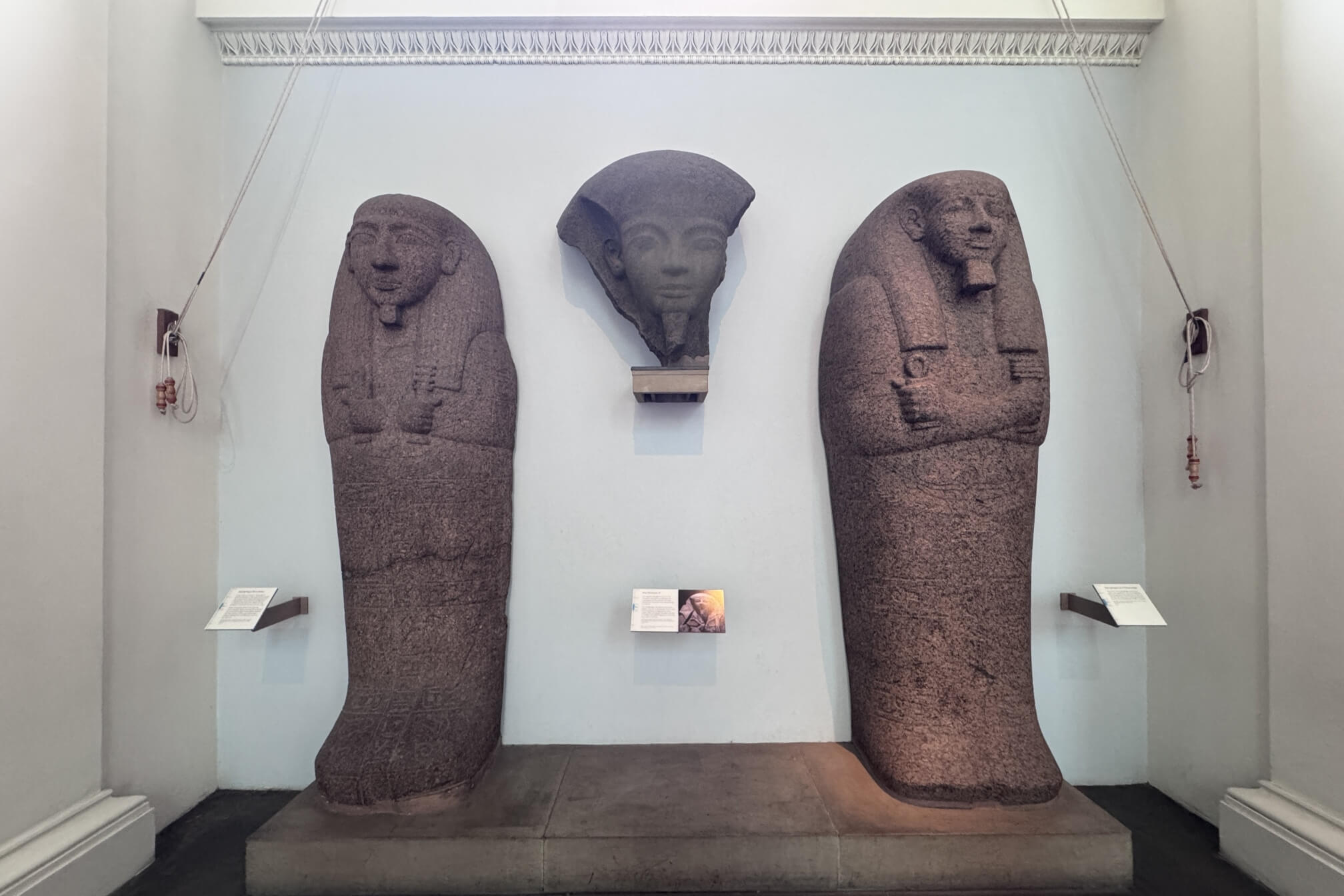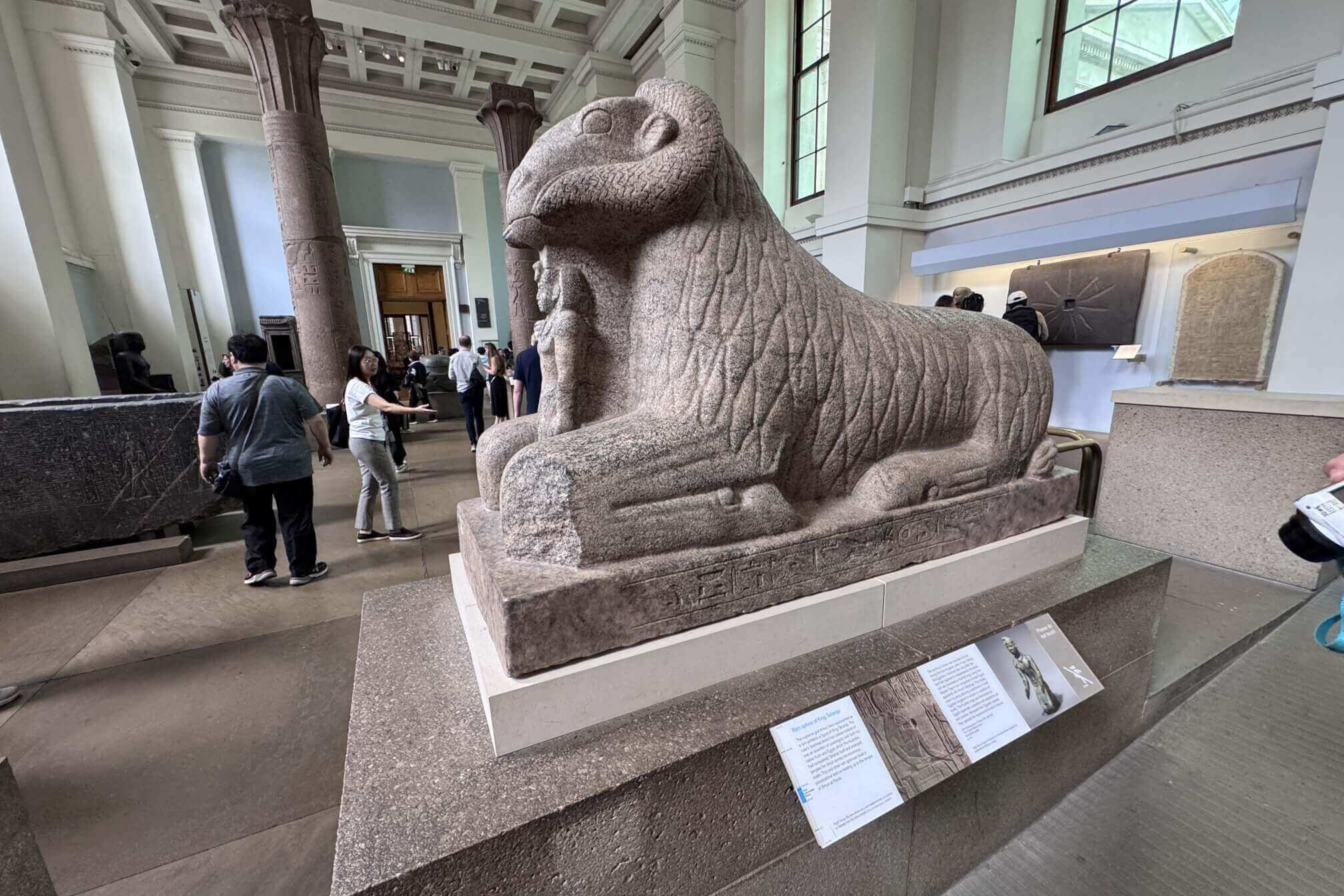↓這尊花崗岩公羊獅身人面雕像,原立於埃及卡納克神殿(Karnak Temple)獅身人面像大道上一千多尊中的一尊,製於公元前1390~52年間,象徵著法老作為埃及守護神的角色;於19世紀由考古學家挖掘取得,成為大英博物館的收藏。