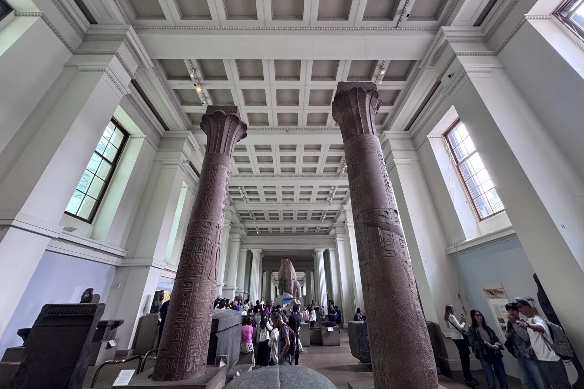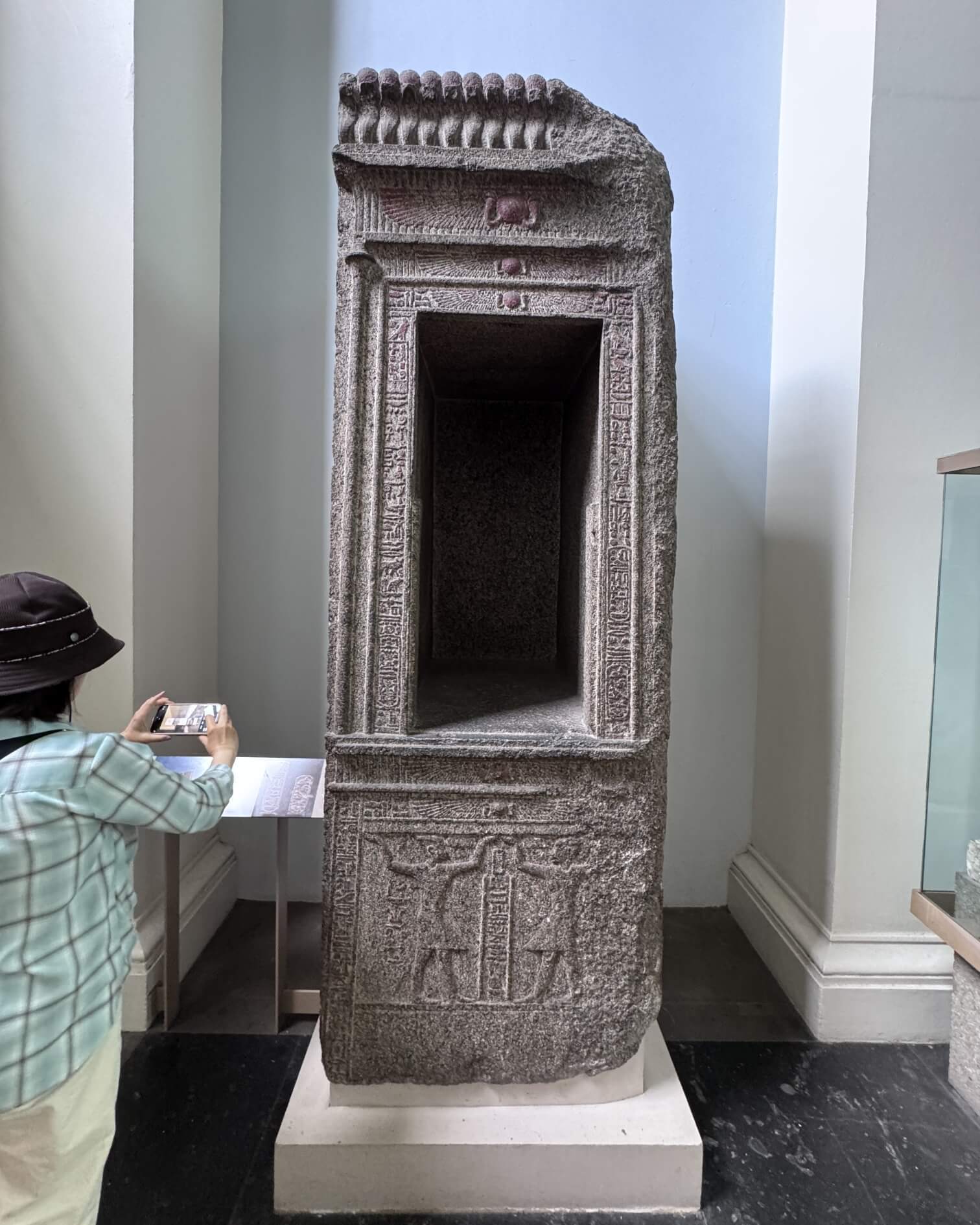 ↓一上二樓,就可以看見這兩根來自古埃及的海港城市卡諾珀斯(Canopus)的巨大石柱。這兩根石柱原在一座神廟中,石柱上刻有「聖書體Hieroglyphic」銘文,於1801年被英國軍隊從埃及帶回,後於1803年捐贈給大英博物館。