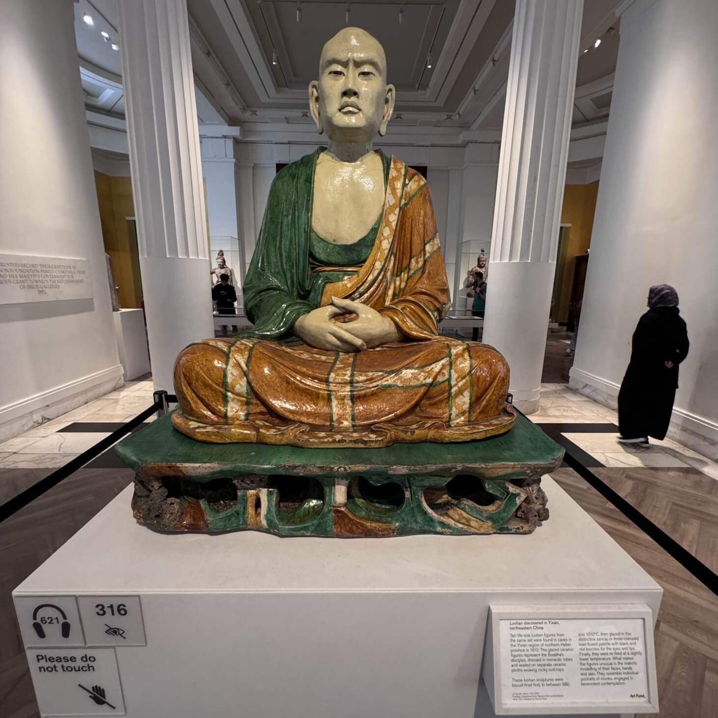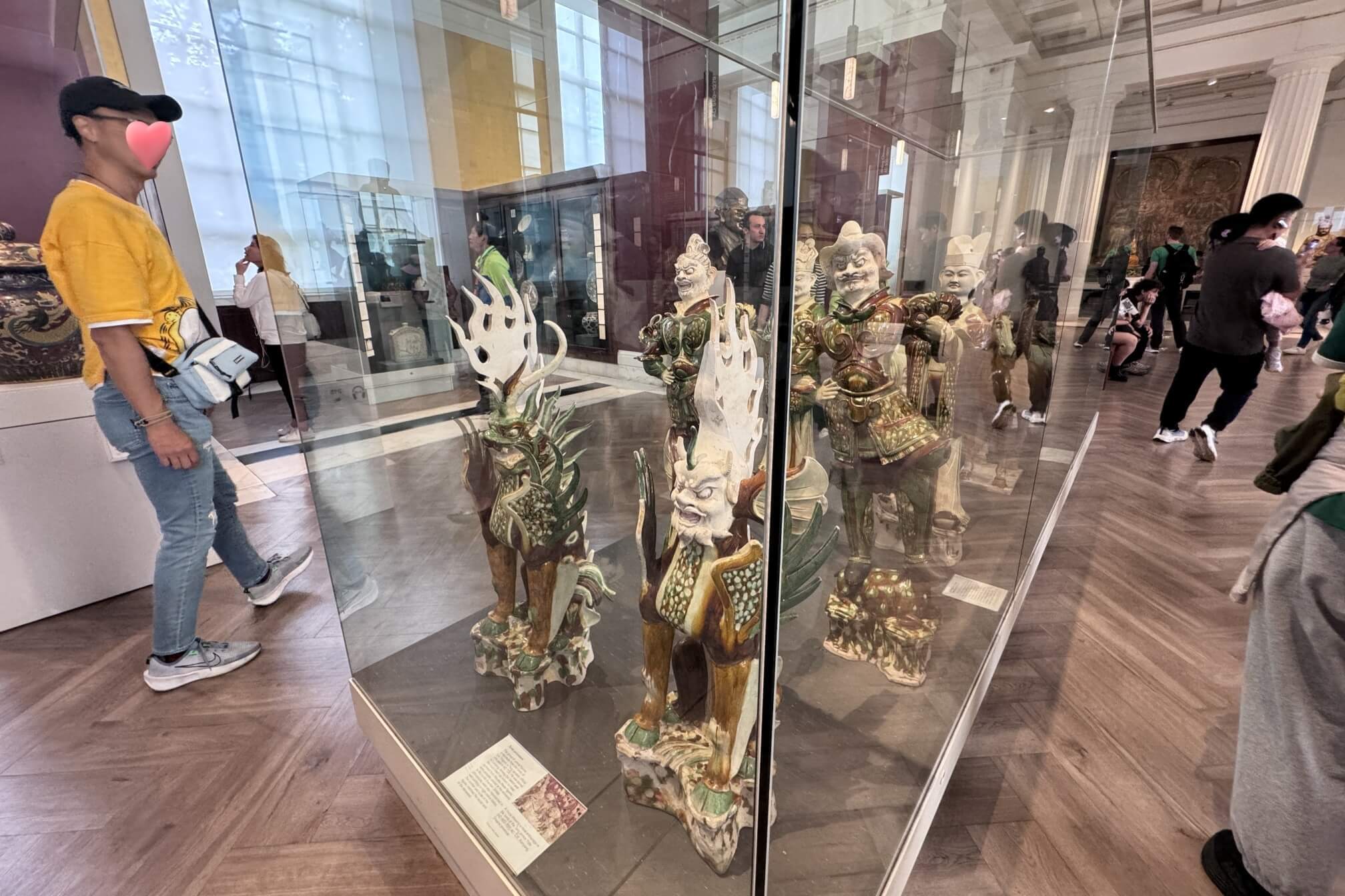↓玻璃展櫃中的這些雕像,是明代晚期或清代早期的三彩陶塑,雕像色彩豐富、光澤亮麗,是道教或佛教的護法神像,有威武、莊嚴及猙獰威猛的姿態,身披鎧甲,手持法器,以保護寺廟和信眾。