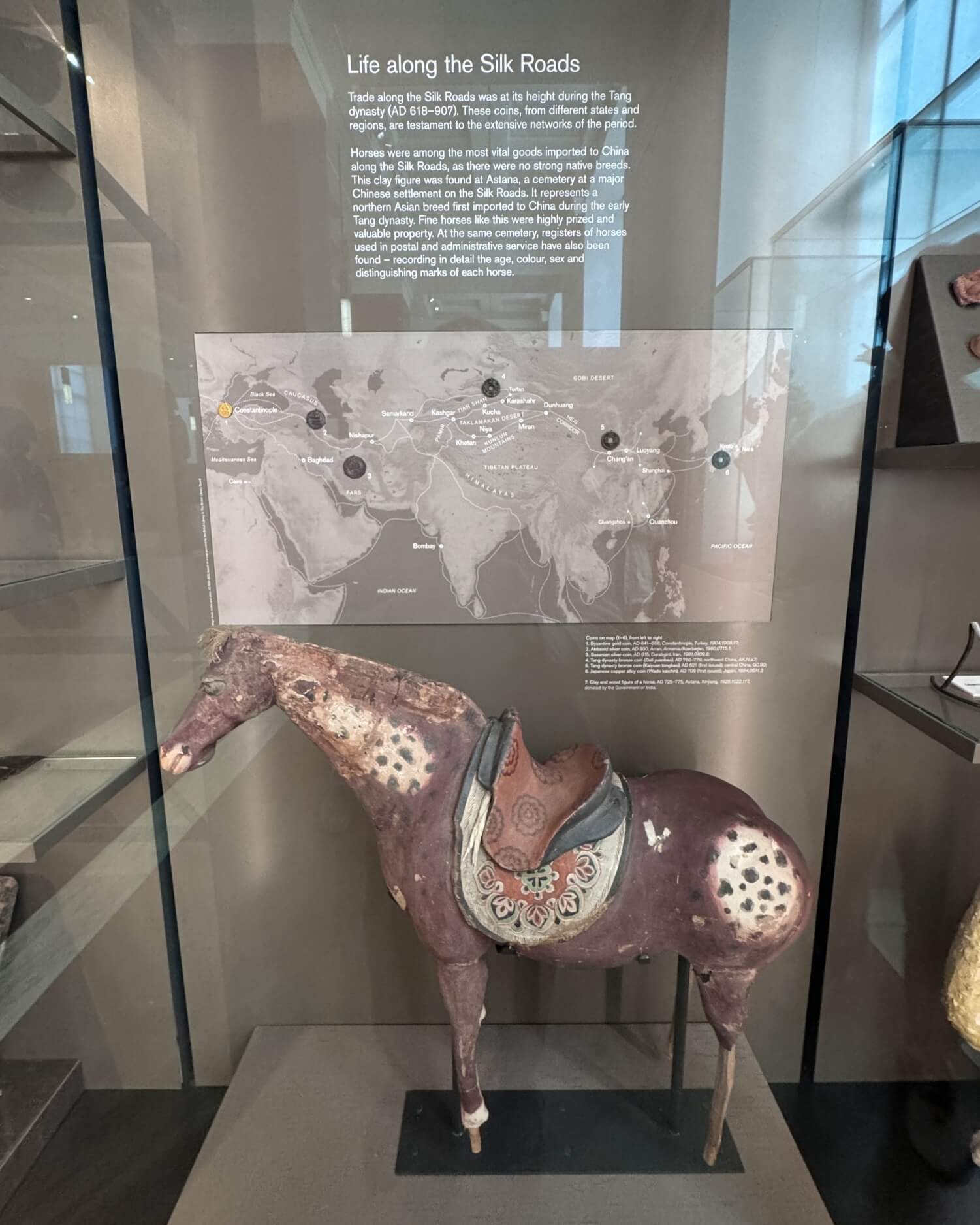 ↓「絲綢之路」是唐朝通往西亞進行貿易的重要通道,而馬匹則是透過絲綢之路進口到中國的重要商品之一,照片中的馬匹是黏土馬,在絲綢之路上發現的。